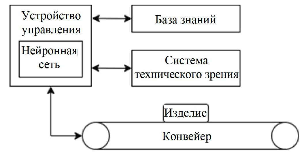 Для решения данной задачи предлагается управлять положением камеры, состоянием окружающей среды с использованием методов искусственного интеллекта [4]. В контуре управления системой выходного контроля качества расположена нейронная сеть, которая на основе входных параметров (скорости движения ленты, уровня освещенности и расстояния от камеры до изделия) позволяет подбирать управляющее воздействие, изменяющее положение камеры быстро и с высокой точностью. Для согласованности действий всех компонентов рассмотренной системы необходимо учитывать параметры движения конвейерной линии с расположенными на ней изделиями.