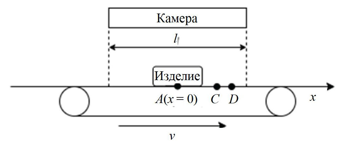 Пусть камера, сканирующая расположенные под ней проверяемые изделия, расположена в точке над конвейерной лентой, движущейся с постоянной скоростью v (рис. 2). Для удобства расчетов определим проекцию точки расположения камеры на ось x в точку А c координатой x = 0.
