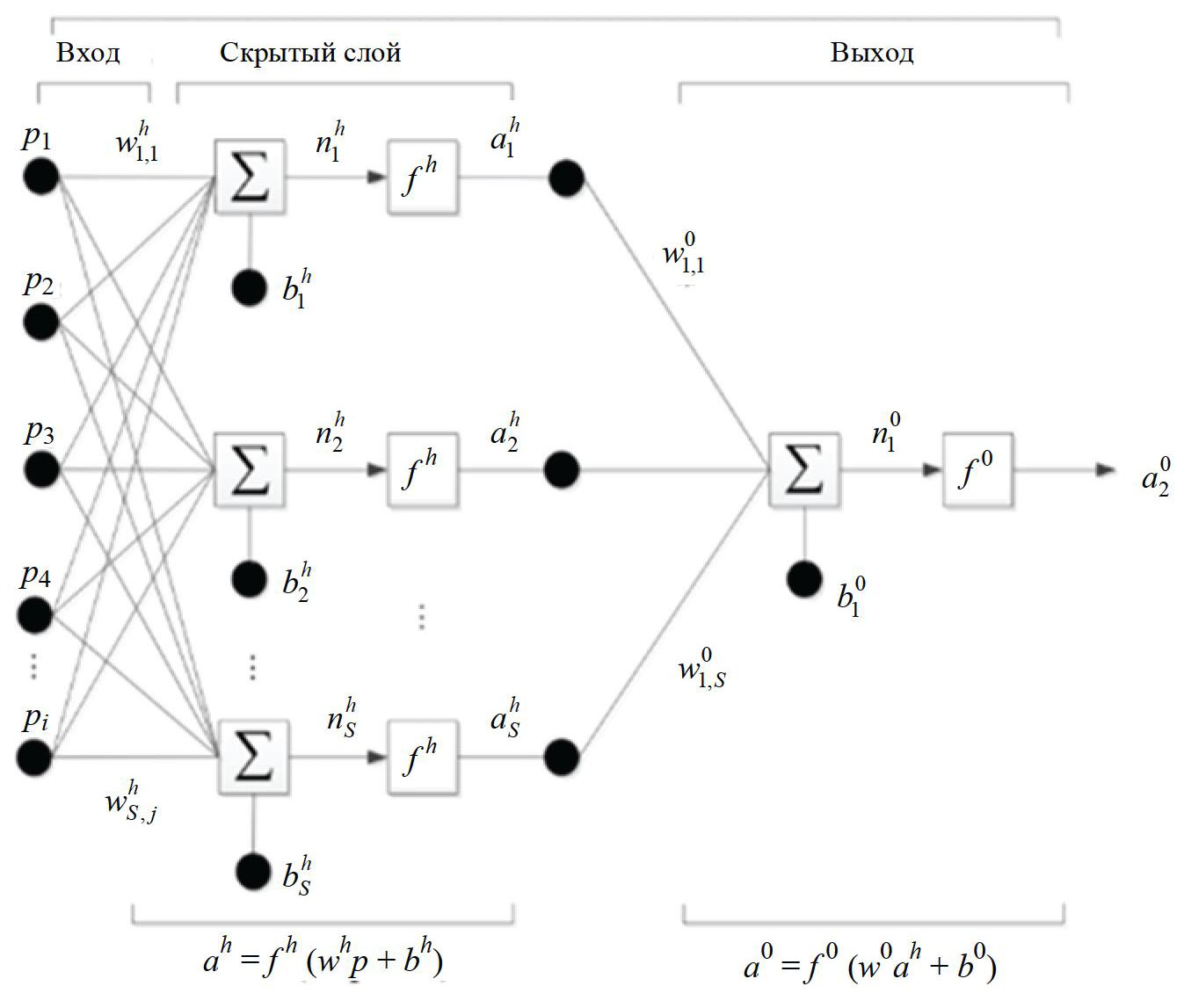 (12) - в выходном слое используется та же процедура, что и в скрытом слое, за исключением того, что задействован только один нейрон и линейная функция для вычисления .