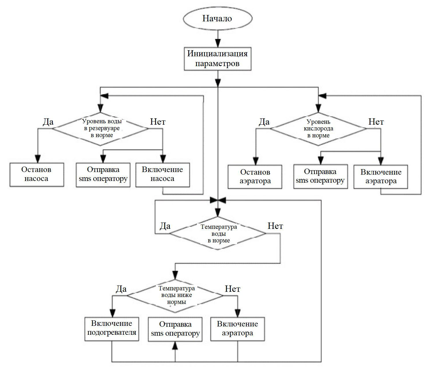 В основе программного обеспечения ПАК лежит следующий алгоритм работы микроконтроллера (рис. 3). На первом этапе контроллер опрашивает датчики и сравнивает их показания с допустимыми значениями. Если уровень воды ниже заданного значения, то контроллер подает сигнал на запуск водяного насоса, который работает до тех пор, пока резервуар не заполнится до рекомендованного объема. Если вода в резервуаре находится на достаточном уровне, тогда система проверяет значения кислорода в воде и температуры. В случае, когда кислород находится в нормально допустимом диапазоне (8,3…9,2 мг/л), аэратор выключен. При снижении уровня допустимой концентрации кислорода, контроллер запускает аэратор до тех пор, пока уровень кислорода в воде не придет в норму [5].