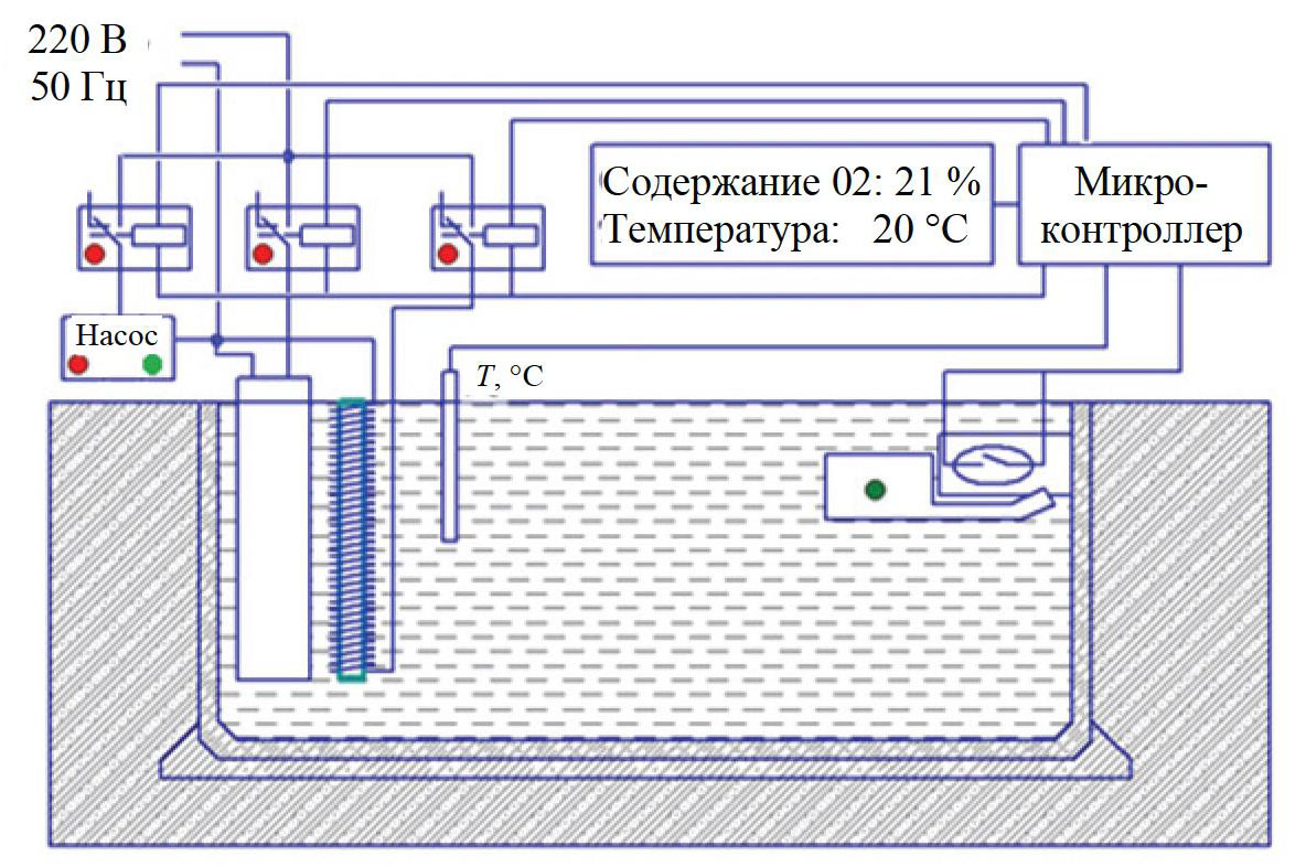 Данные с датчиков (температуры, кислорода и уровня воды) передаются на микроконтроллер, затем на дисплей АРМ в целях отслеживания текущего состояния оператором. Микроконтроллер подает сигнал о работе насоса, аэратора и нагревательного элемента в зависимости от полученных данных. При отсутствии сигнала с какого-либо датчика включается аварийный режим системы управления.