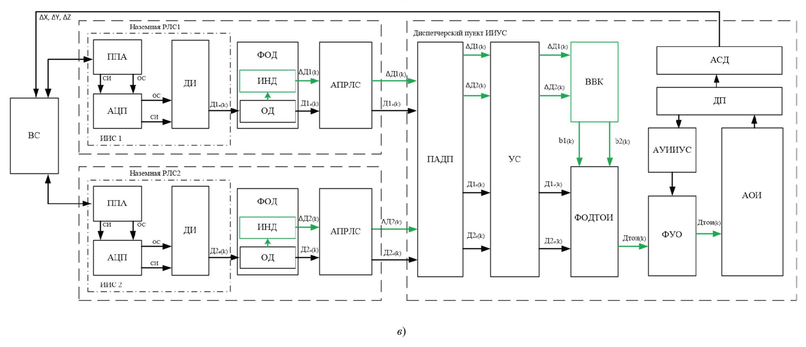 Рис. 1а. Структура ИИУС с применением третичной обработки информации методом математического усреднения дальности до ВС (а) (начало)