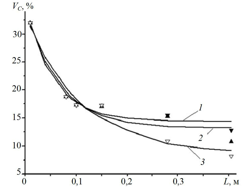 Рис. 1. Зависимость коэффициента неоднородности смеси от расстояния до точки загрузки при различных углах наклона лопастей α: 1 – α = 90°, VC = 21,0exp(–L/0,05) + 14,4; 2 – α = 60°, VC = 21,6exp(–L/0,07) + 13,2; 3 – α = 45°, VC = 25,0exp(–L/0,11) + 8,7 (значки – экспериментальные точки, линии – аппроксимирующие функции)