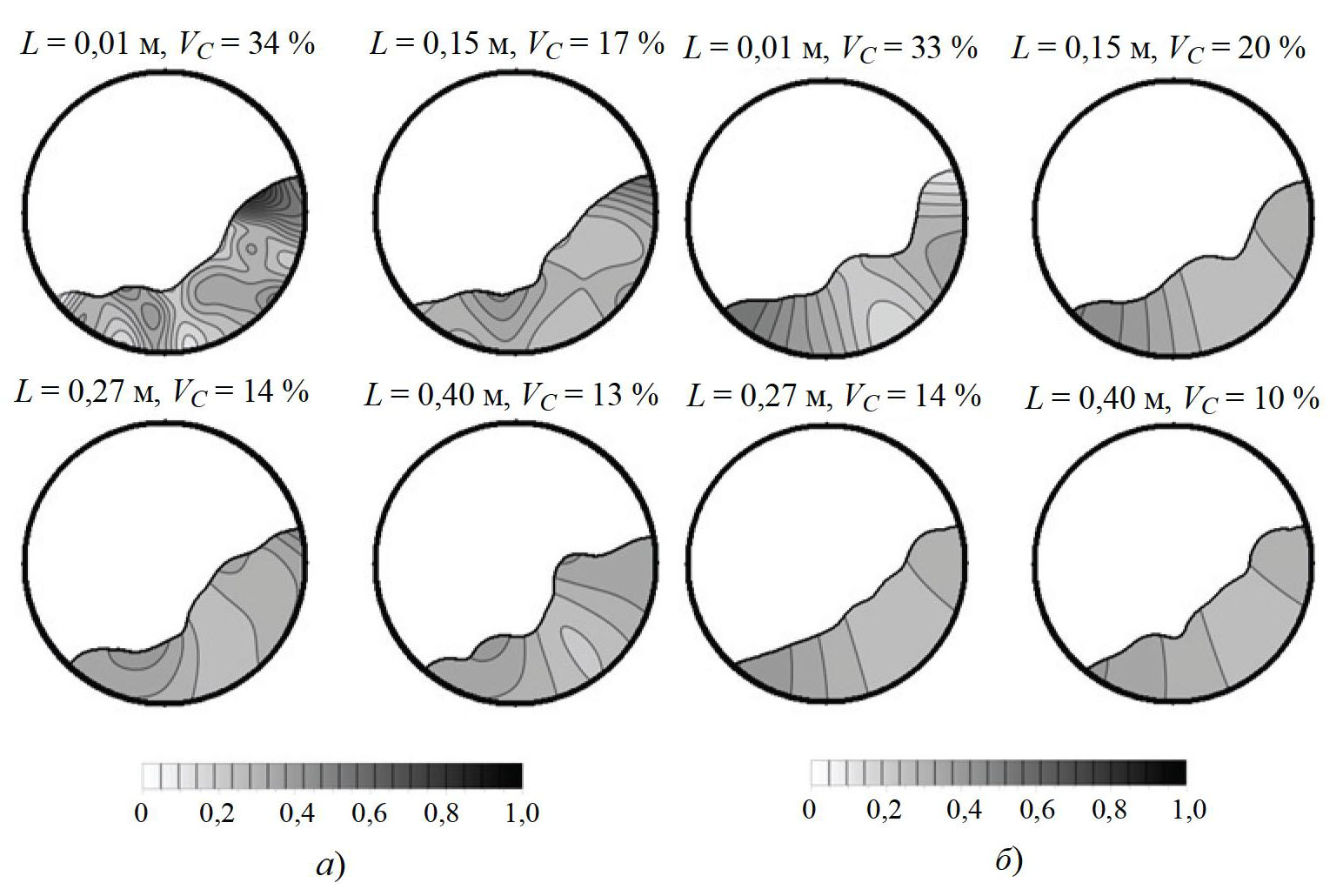 компонента в соответствующем сечении. На рисунках 3, а, б представлены контурные графики рассматриваемых полей для углов отгиба лопастей α = 90° и α = 45°. Картина распределения ключевого компонента смеси по сечению на рисунках качественно соответствует наблюдавшейся в экспериментах, также на рисунках указаны вычисленные по представленным полям концентрации значения коэффициента неоднородности VC. Приведенные значения удовлетворительно согласуются с экспериментальными данными (см. рис. 1).