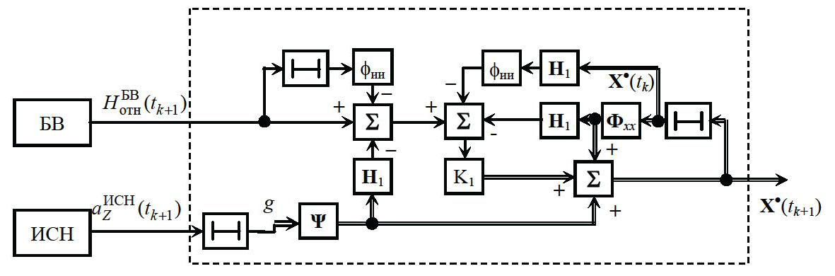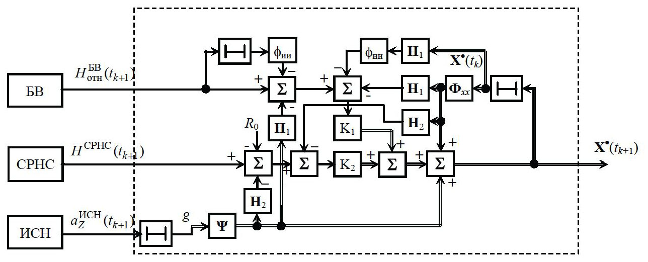 Уравнение (19) определяет структуру канала оптимальной обработки выходных сигналов БВ и ИНС. Структурная схема канала обработки информации в информационно-измерительной и управляющей системе – навигационно-посадочном комплексе по сигналам ИНС и БВ, разработанная на основе алгоритма (19) представлена на рис. 3.