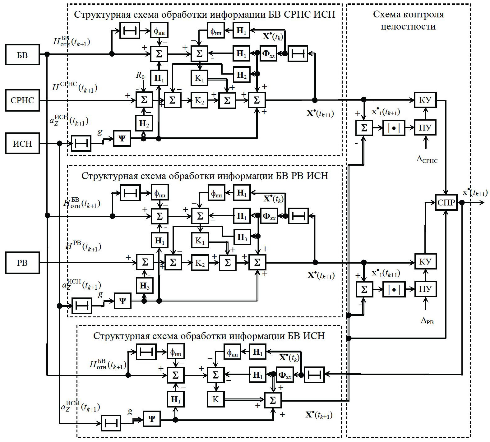 В соответствии с полученными оптимальными алгоритмами обработки информации разработана структурная схема обработки информации в информационно-измерительной и управляющей системе – навигационно посадочном комплексе с контролем целостности истинной высоты полета ЛА. Структурная схема, представленная на рис. 4, включает канал обработки информации по сигналам СРНС, ИНС и БВ; канал обработки информации по сигналам РВ, ИНС и БВ; канал обработки информации по сигналам ИНС и БВ; схему контроля целостности.