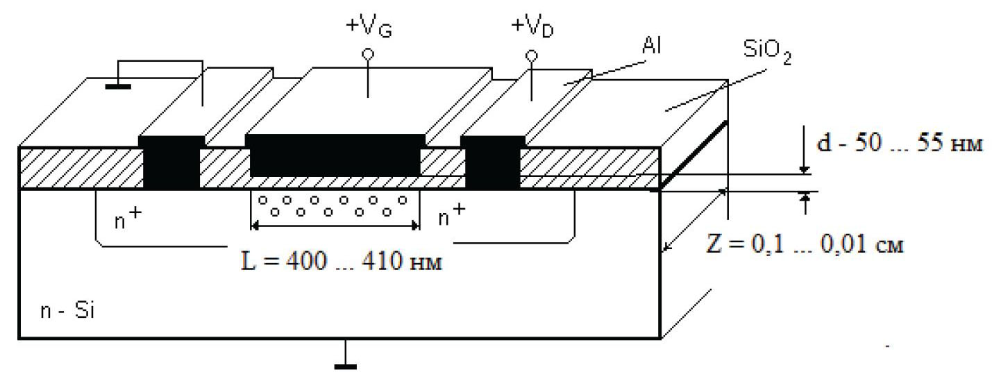 Отличительной особенностью предлагаемого ПИП, сформированного на кремниевой подложке n-типа [8] (легированной донорной примесью), является работа в режиме обогащения основными носителями заряда – электронами. На затвор подается положительный потенциал, и созданное им поле формирует между истоком и стоком канал из электронов – основных носителей заряда (режим обогащения). Отличие от приведенных в работах [5 – 7] преобразователей – потенциал на затворе при работе в режиме обогащения не имеет порогового значения, следовательно, электропроводимость в канале существует при любом значении потенциала на затворе, самом малом, что значительно уменьшает потребление энергии. Принцип работы преобразователя температуры основан на термогенерации носителей заряда. С ростом температуры происходит ионизация примесных и собственных атомов полупроводника, отдающих электроны, что приводит к увеличению удельной электропроводности.