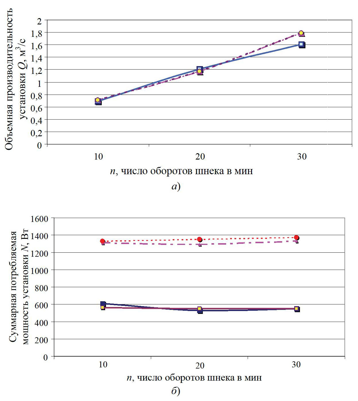 В результате проведенных экспериментов и анализа полученных данных построены графические зависимости от частоты вращения шнека при различных диаметрах мундштука dм (см. рис. 2, 3). Производительность монотонно растет с увеличением частоты вращения шнека до 30 об/мин. (см. рис. 2, а). Минимальная потребляемая мощность под воздействием УЗ соответствует частоте вращения шнека 20 об/мин, а с увеличением частоты вращения до 30 об/мин мощность незначительно увеличивается. Расхождение между теоретическими и экспериментальными значениями составляет менее 10 %. (см. рис. 2, б).
