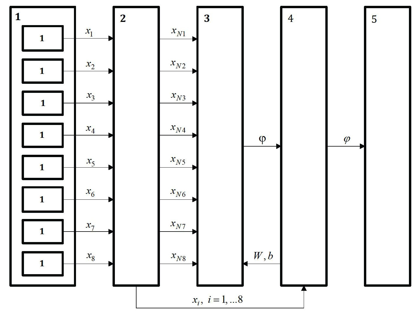 where S is a network model; r is a network model number; is a multitude of elements of the input layer of the network; is a connection matrix (synapse weights of the neurons of the first hidden layer), with the dimension ; is a connection matrix (synaptic weights of the neurons of the second hidden layer), with the dimension ; is a connection matrix (synaptic weights of the neurons of the third hidden layer), with the dimension ; is a multitude of states of the neurons of the 1st hidden layer, here, the power of the multitude is determined by the calculation number of neurons of the 1st hidden layer equal to ; is a multitude of states of neurons of the 2nd hidden layer, here, the power of the multitude is determined by the calculation number of neurons of the 2nd hidden layer equal to ; is a multitude of states of neurons of the 3rd hidden layer, here, the power of the multitude is determined by the calculation number of neurons of the 3rd hidden layer equal to ; is a multitude of neurons of the 1st hidden layer, the power of the multitude is equal to ; is a multitude of neurons of the 2nd hidden layer, the power of the multitude is equal to ; is a multitude of neurons of the 3rd hidden layer, the power of the multitude is equal to ; is a vector of links (vector of weight coefficients of the output layer); are the displacement vector for the 1-hidden layer, the displacement vector for the 2-hidden layer and the displacement vector for the output layer; are activation functions ReLu, is a linear function of the activation.