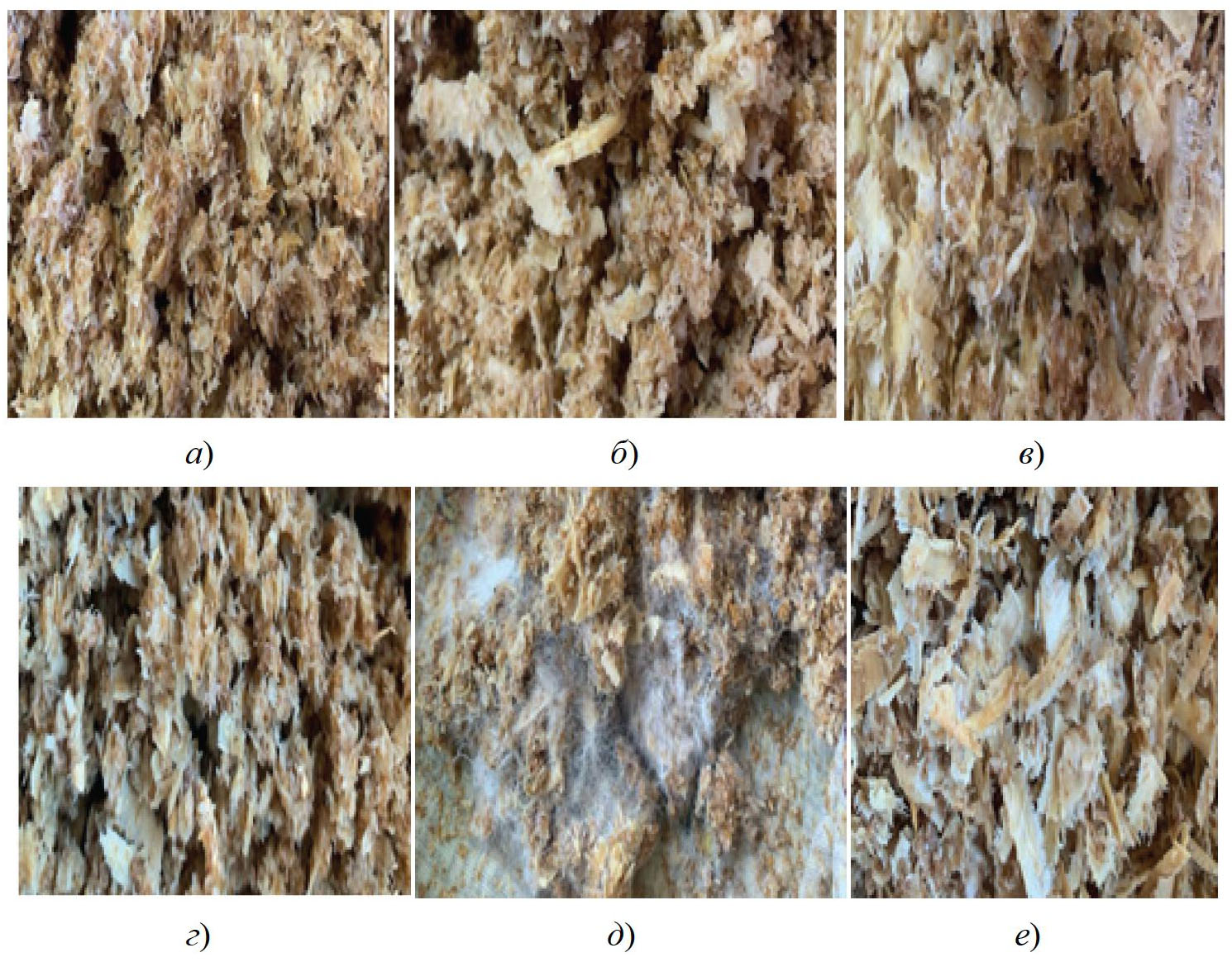 Рис. 1. Характерные фрагменты ферментативной среды после двух (а – в) и четырех (г – е) суток культивирования микроскопического гриба Trichoderma viride в статико-динамическом режиме в процессе твердофазного ферментативного гидролиза целлюлозосодержащего сырья для субстратов различного фракционного состава, мм: а, г – 0…1; б, д – 1…3; в, е – 3…5