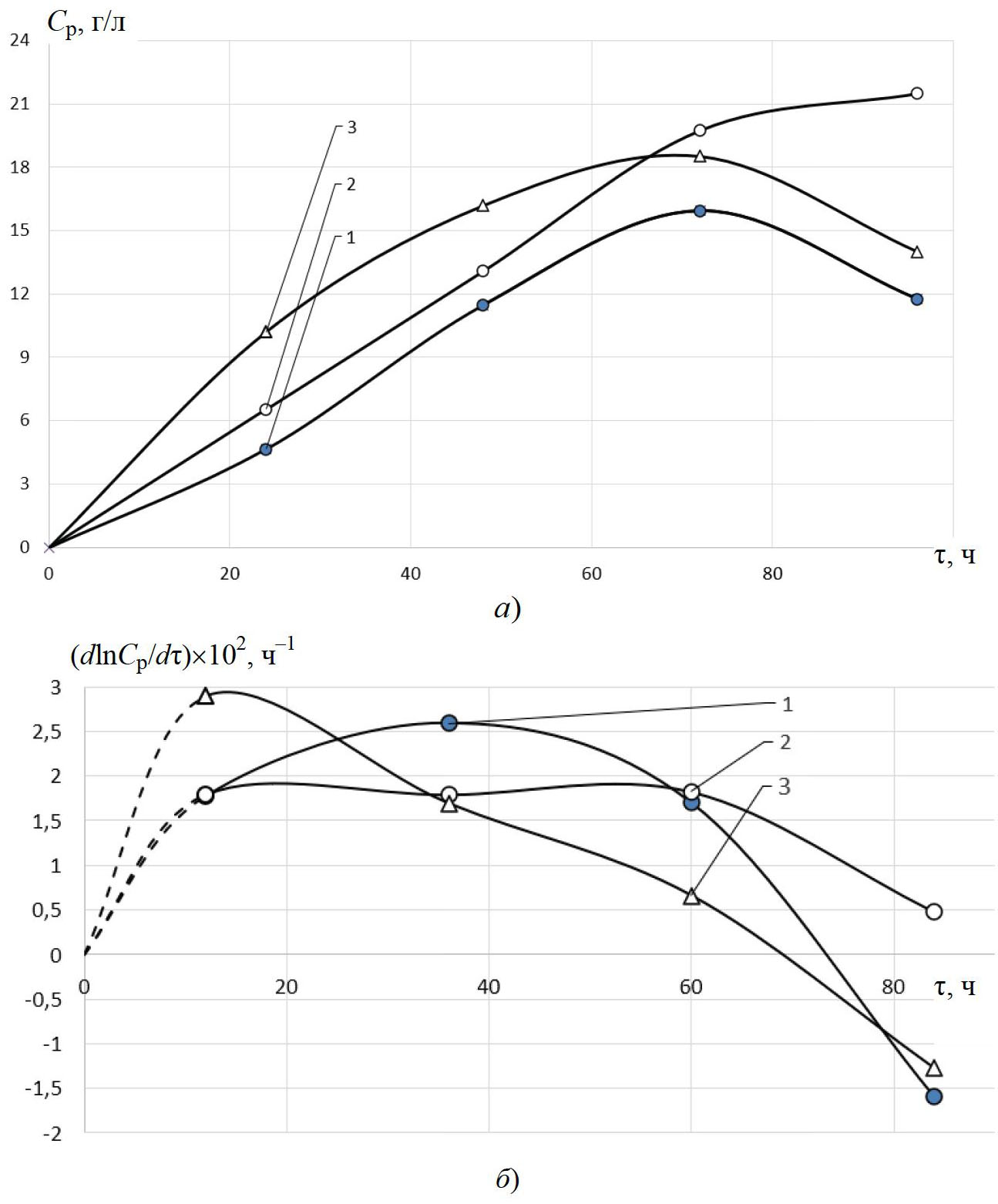 Рис. 2. Динамика изменения концентрации белка (а) и относительной скорости ее прироста (б) в процессе твердофазной биоконверсии целлюлозосодержащего сырья при различном фракционном составе частиц целлюлозосодержащего твердого субстрата: 1 – 0…1 мм; 2 – 1…3 мм; 3 – 3…5 мм