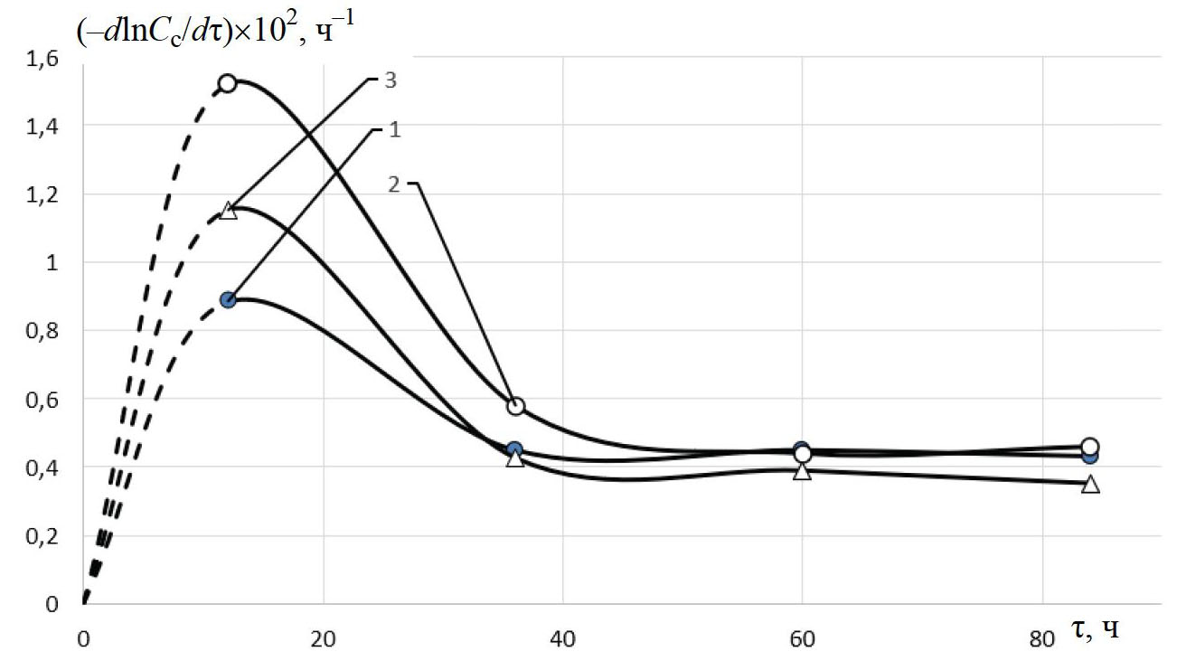 В исследованном периоде твердофазного ферментолиза целлюлозосодержащего сырья наблюдаются примерно равные средние интегральные значения скорости процесса в случаях крупно- и мелкодисперсного субстратов, что подтверждается для них практически одинаковой достигнутой степенью конверсии целлюлозы (см. рис. 4). Однако динамика изменения кинетических характеристик ферментолиза в названных вариантах организации процесса позволяет сделать вывод о том, что на начальной его стадии более высокой интенсивностью характеризуется вариант с крупнодисперсным твердым субстратом. На последующих же стадиях в таком варианте процесса, в отличие от альтернативных его вариантов, наблюдается существенное и систематическое снижение интенсивности ферментолиза, что, очевидно, связано с возрастающим доминированием в этом случае диффузионной кинетики.
