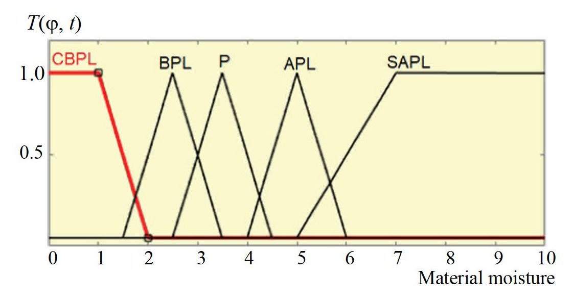 Let's introduce the following designations of fuzzy variables: CBPL – the level of humidity and temperature of the material is considerably below the permissible level; BPL – humidity and temperature correlate with the level below the permissible level; P – the level of humidity and temperature is within the permissible ranges (the level is permissible); APL – humidity correlates with the level above the permissible level; SAPL – the level of humidity and temperature is significantly above the permissible limits.