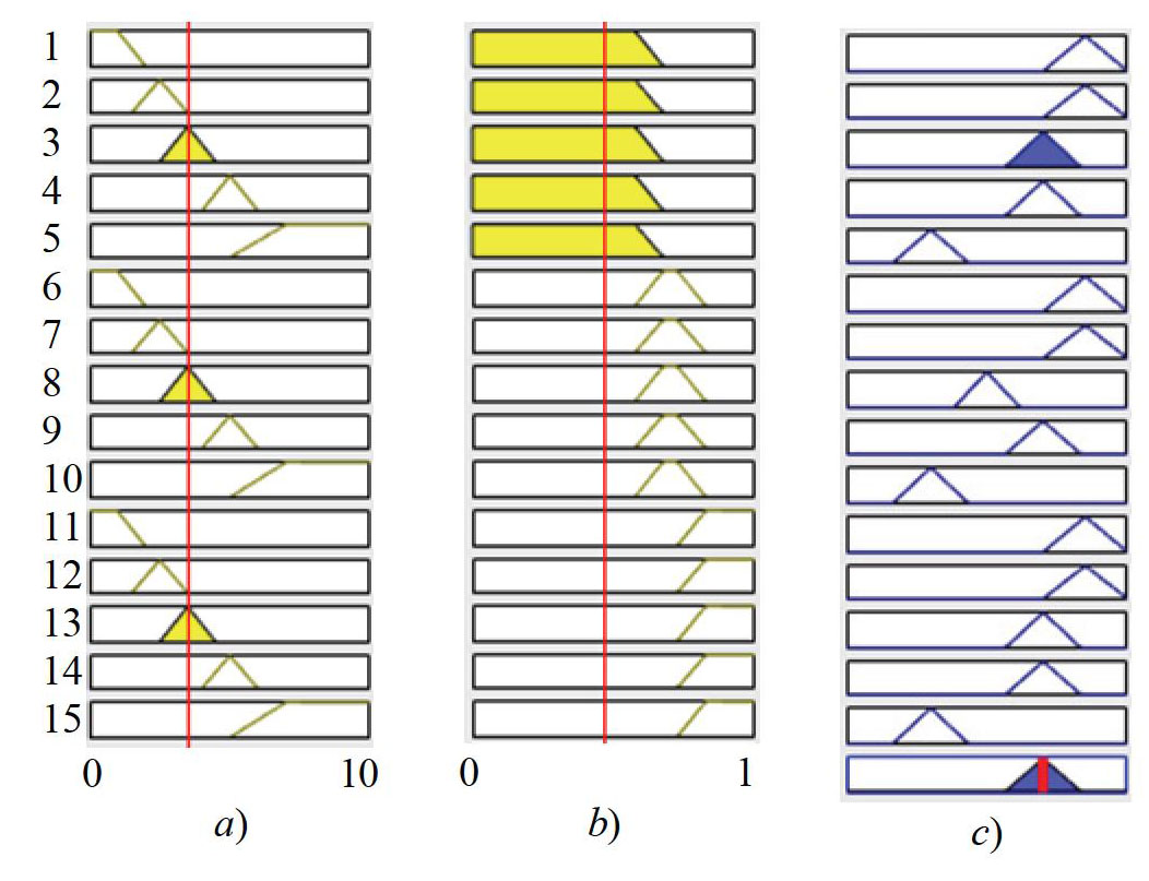 Let us consider the application of calculations using the centre of gravity method. Fuzzy regions for input values are shown in Figs. 2 – 4.