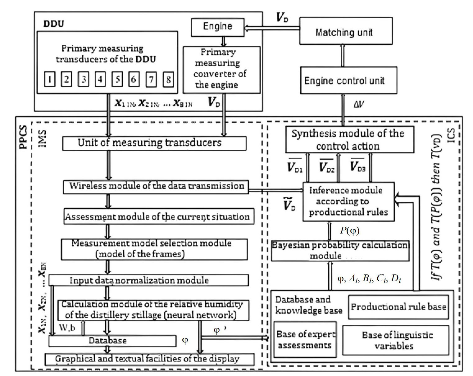 The system includes several modules and an aggregate of primary measuring transducers of technological parameters of the drying process. The main modules of the IMCS include: the module of normalized input variables, the module of measurement model selection, the module of calculation of relative humidity of distillery stillage [3], the module of the syntheses of the control actions, the inference module according to production rules, and the module of Bayesian probability calculation. Also, the IMCS contains databases and knowledge, graphical and textual means of information display.