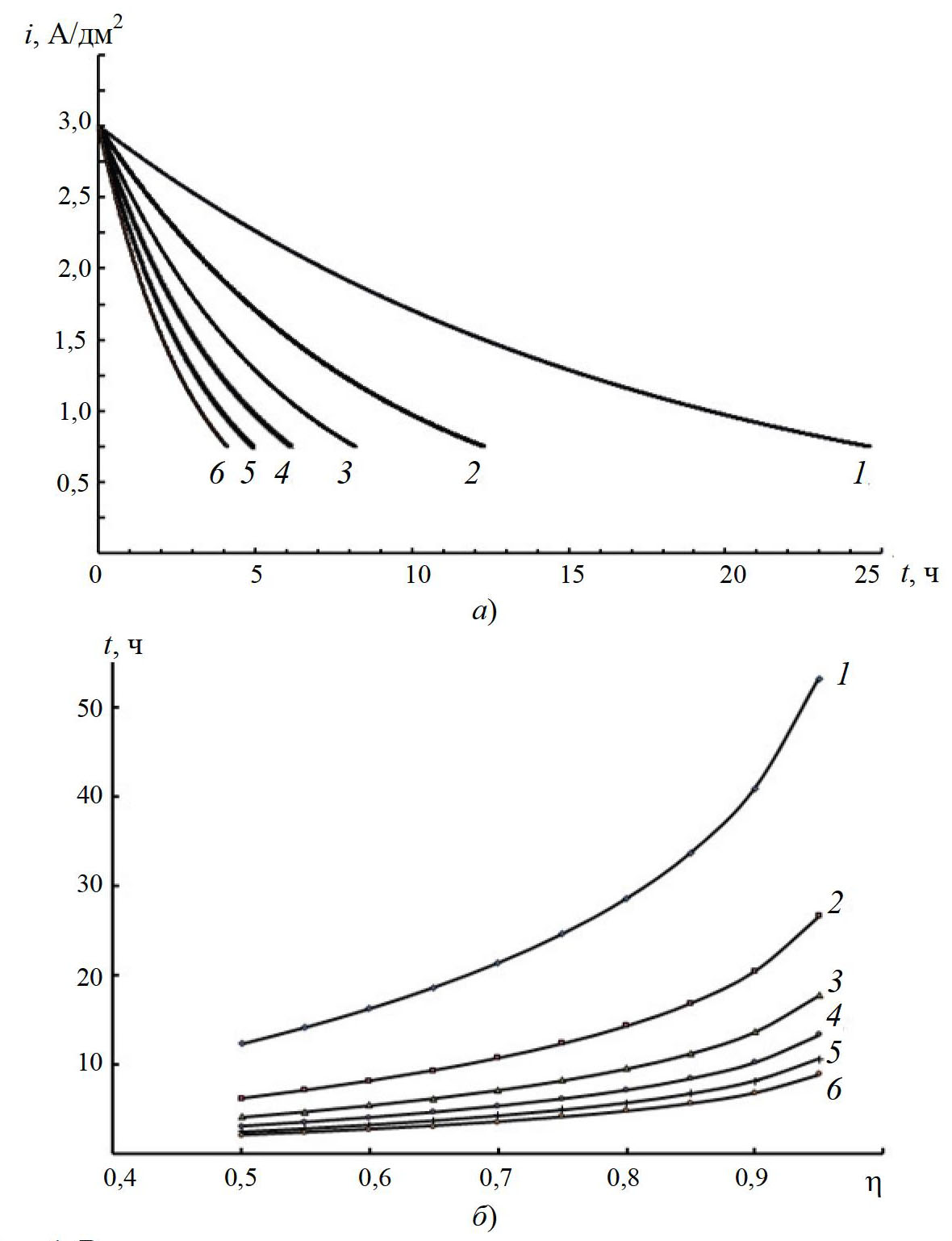 Рис. 1. Расчетные зависимости изменения плотности тока во времени (а) и времени электроэкстракции от предполагаемой степени извлечения меди (б): номер кривой соответствует величине S/V, дм–1