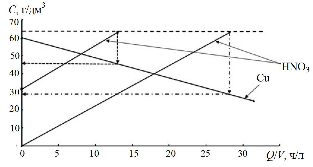 где q – электрохимический эквивалент, г/(А∙ч); Q – количество пропущенного электричества, А∙ч; V – объем электролита, г/дм3; СCu, 0 и СHNO3, 0 – концентрации соответственно меди и азотной кислоты в начале электролиза.