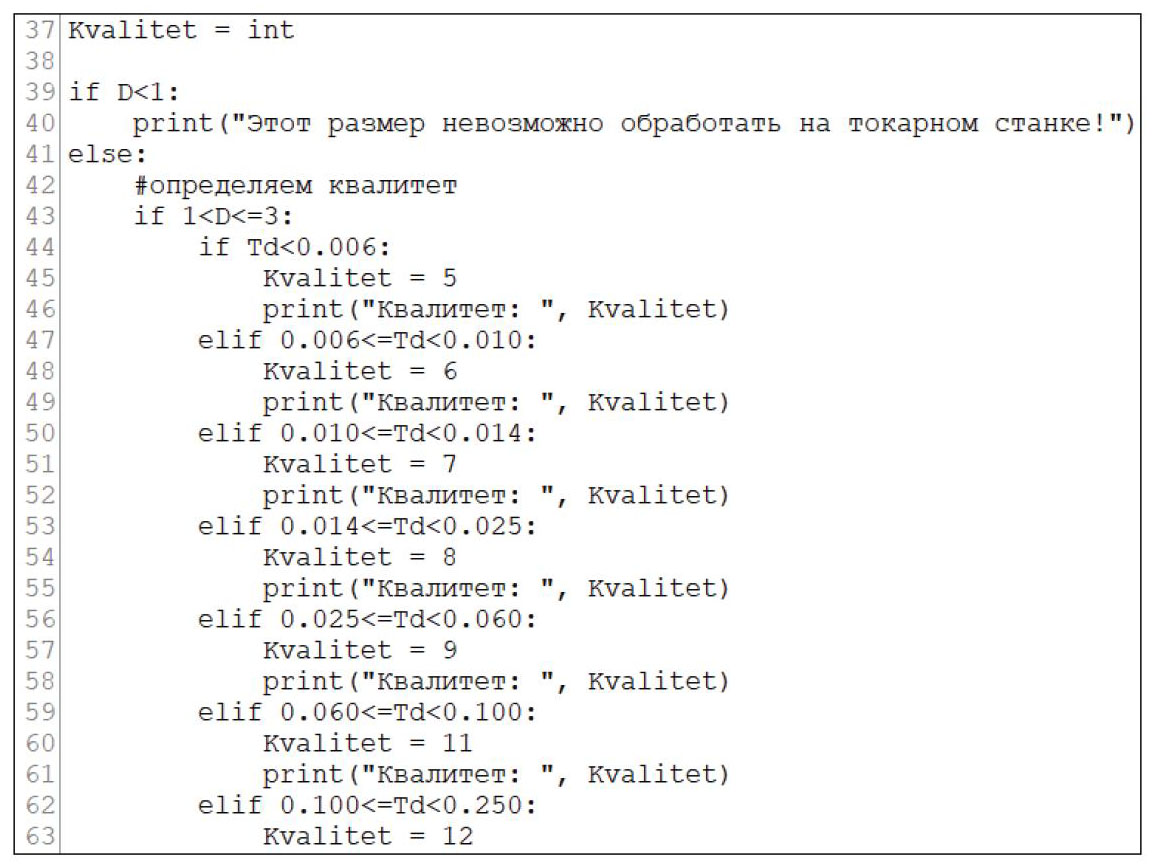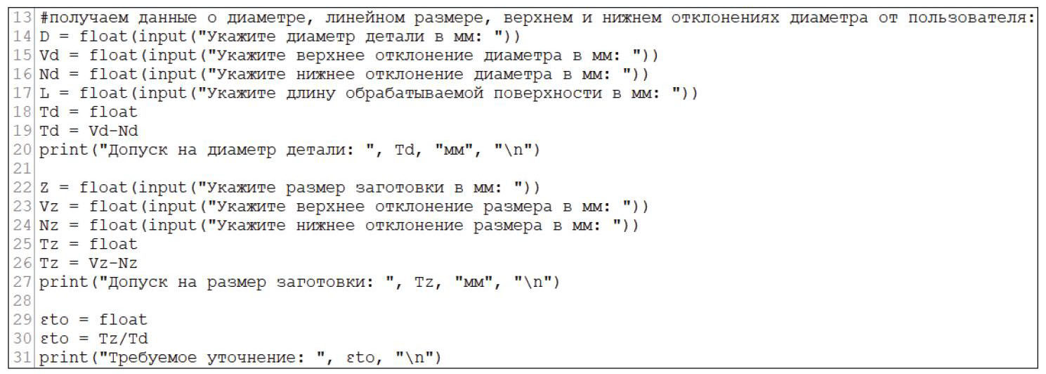 На рисунке 1 программа выполняет расчет требуемого уточнения , используя данные, введенные пользователем. При этом программа определяет поля допусков размеров детали и заготовки в строках 19 и 26.