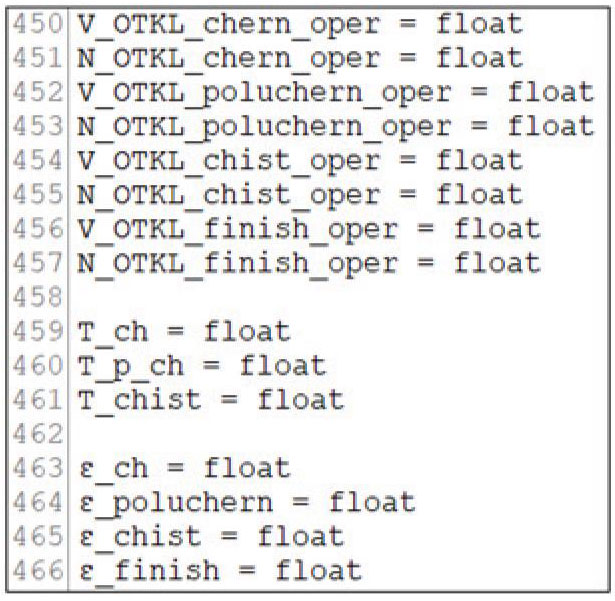 На рисунке 3 показано создание переменных: V_OTKL – переменная, содержащее верхнее отклонение для соответствующей операции; N_OTKL – нижнее отклонение; T_ch, T_p_ch, T_chist – поля допуска для черновой, получистовой и чистовой операций соответственно; ε_ch, ε_poluchern, ε_chist, ε_finish – уточнения для черновой, получистовой, чистовой и финишной операций соответственно. При этом параметр T_finish – переменная, которая хранила бы в себе поле допуска финишной операции – создавать нет смысла, так как на финишной операции обеспечивается размер детали в пределах его поля допуска, то есть Td уже создан в 18 строке (см. рис. 1). Когда программа создала необходимые переменные, она приступает к выполнению алгоритма определения операций и назначения межоперационных допусков.