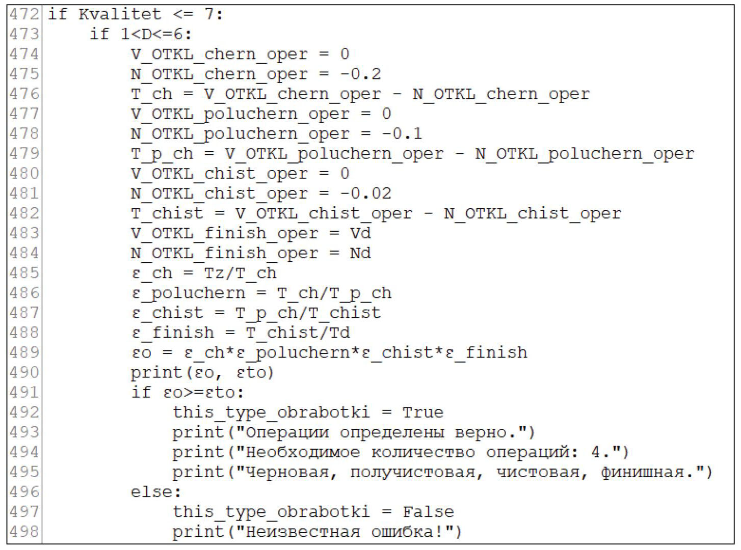 Разработан алгоритм назначения допуска, реализация которого в среде программирования Python позволяет выполнять расчеты для всех технологических операций токарной обработки деталей и подбирать их количество, то есть позволяет выбрать от одной до четырех операций, назначить допуск для каждой операции и сразу выполнить проверку соответствия заданной точности размеров детали. Представлен алгоритм для определения отклонений на примере токарной обработки заготовки в виде проката, который может быть закреплен в патроне или в центрах. После этого определение всех необходимых параметров для расчета припуска завершено. Вторым этапом разработки программы будет написание алгоритма, реализуемого в среде программирования Python, для расчета самого припуска.