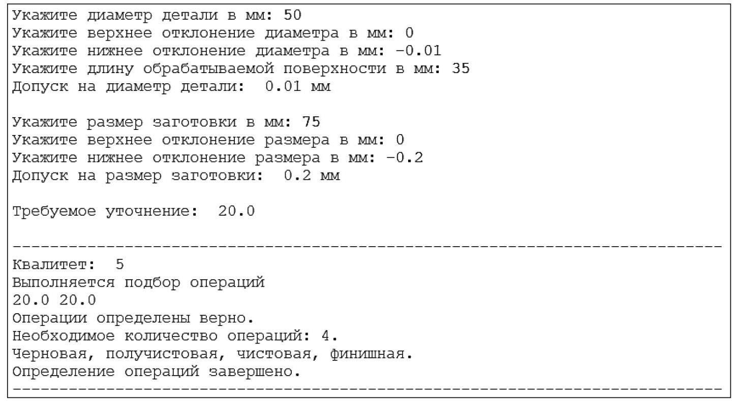 Программа определила квалитет и выполнила подбор операций, строка с цифрами «20.0 20.0» показывает значения требуемого и общего уточнений, из чего можно сделать вывод об их равенстве. О правильности выбора операций также говорит следующая строка «Операции определены верно». В случае, если бы операции были подобраны с ошибками, программа выведет сообщение: «Неизвестная ошибка!».