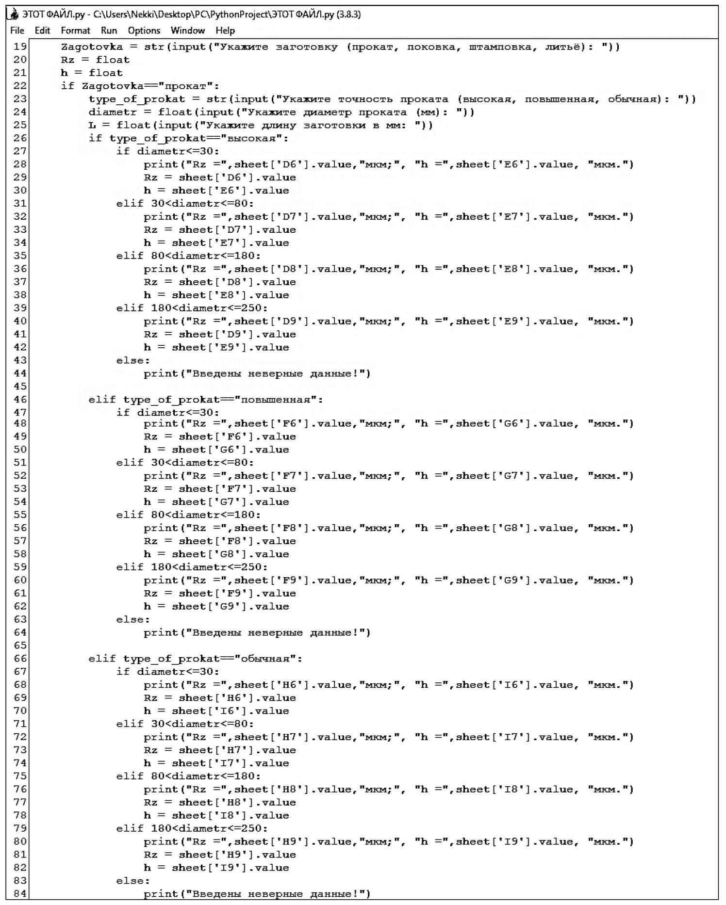 Но, прежде чем перейти к определению припуска, необходимо уточнить, как заготовка закреплена на станке. Это важно, так как в системе «станок – заготовка – инструмент» возникает много погрешностей, связанных со станком, установленной в нем оснасткой, в которой закреплена заготовка, соответственно возникают погрешности закрепления, а также есть погрешности геометрической формы самой заготовки, и все эти погрешности в итоге оказывают влияние на получаемый на станке размер. Поэтому, когда допуск большой, влияние этих погрешностей будет незначительным, но, когда на станке необходимо обработать размер с точностью до микрометра, эти погрешности необходимо учесть. Числовые значения данных погрешностей известны и представлены в виде таблиц в [5], для использования их в Python они были сохранены в формате .xlsx.