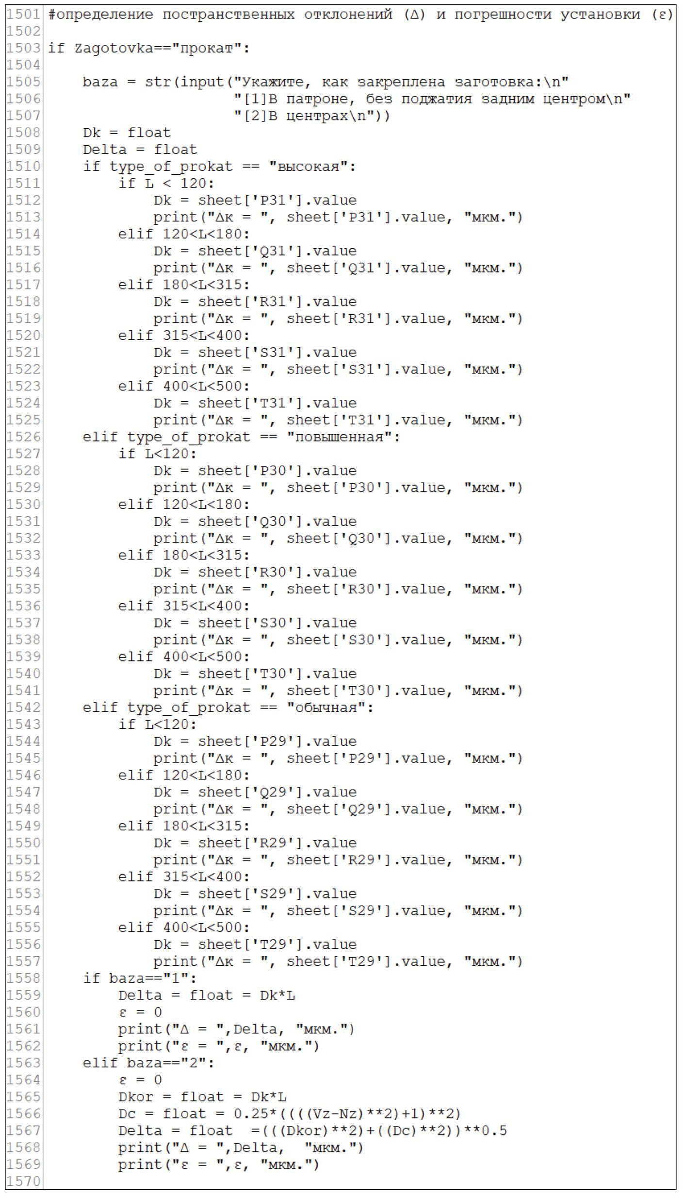 На рисунке 7 представлен фрагмент алгоритма для определения отклонений. В качестве заготовки используется прокат, который может быть закреплен в патроне или в центрах. Затем, в зависимости от длины заготовки и точности проката, определяется параметр ∆к – кривизна профиля сортового проката. В зависимости от способа закрепления заготовки, при необходимости, определяются другие отклонения: ∆кор – возможное коробление заготовки; ∆с – ее смещение в закрепляемом приспособлении станка. Так как при использовании центров или трехкулачковых патронов погрешность базирования равна нулю [4, см. табл. 2.34], что также отражено в строках 1560 и 1564, то суммарная погрешность геометрической формы определяется в строках 1559 и 1567 как параметр Delta. По похожей схеме определяются погрешности для других операций и способов закрепления заготовки.