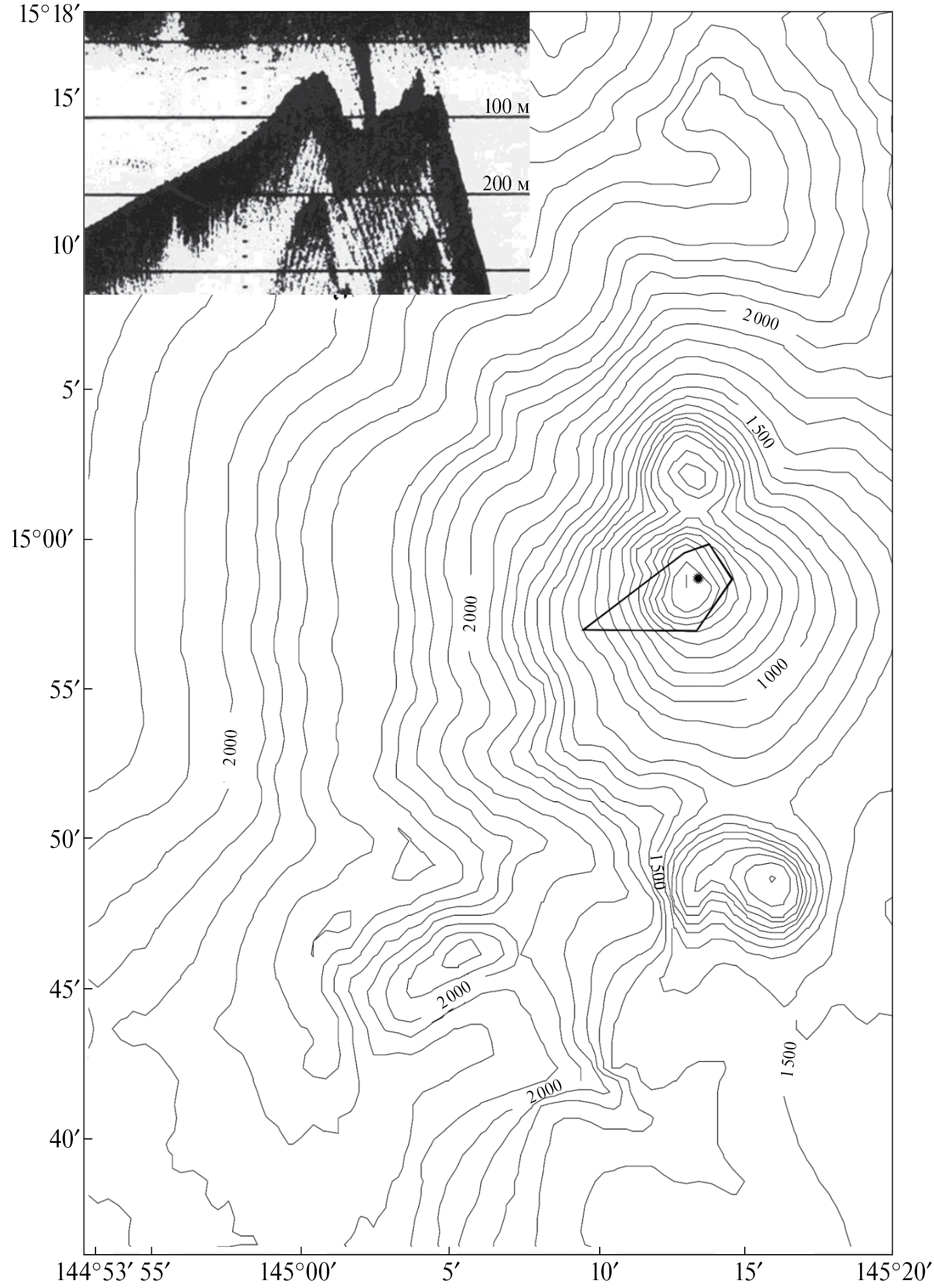 Рис. 2. Батиметрическая карта подводного вулкана Эсмеральда. Многоугольником обозначена область драгирования, а точкой – местоположение подводных фумарол. На врезке показаны фумаролы в кратере вулкана, зафиксированные в 4-м рейсе “Вулканолог”.