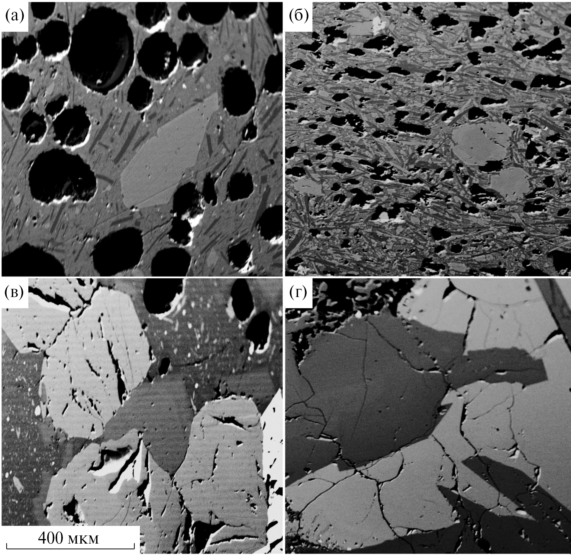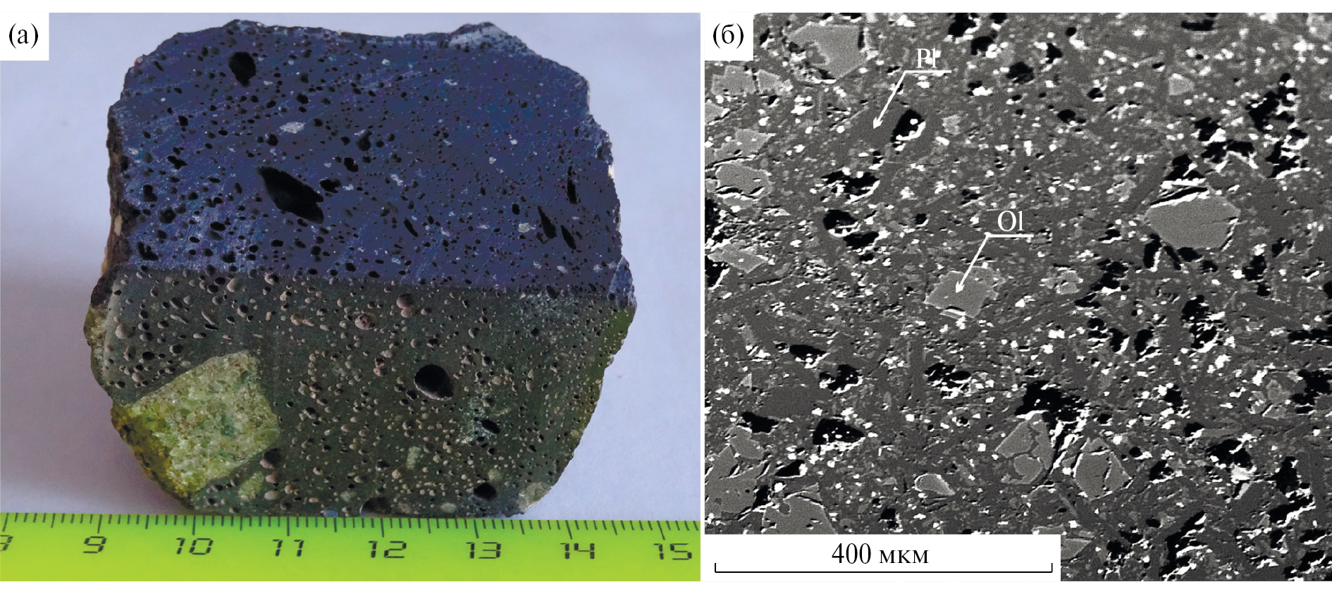 Например, порода в обр. B4-3a (рис. 4а) является стекловатым, пористым, толеитовым Ol‒Pl базальтом с редкими вкрапленниками плагиоклаза размером до 1.5 мм и оливина размером до 1 мм. Стекло насыщено зональными вкрапленниками плагиоклаза, состав которых меняется от An86 в центре до An75 в краевой части и отличается повышенным до 1% в среднем содержанием железа (Fe2O3). Оливин не зональный, Fo66.