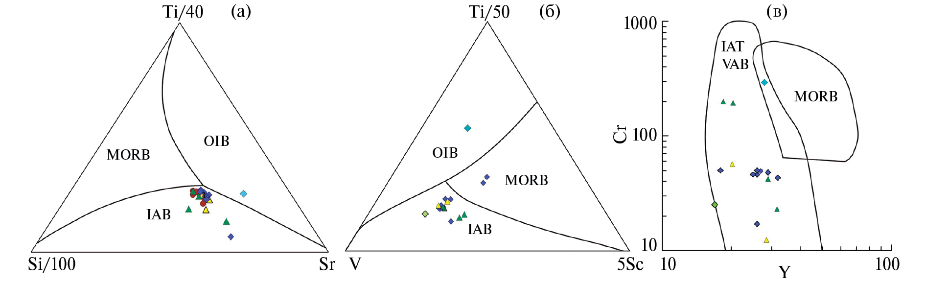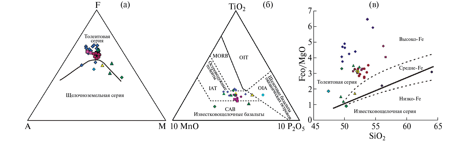 Совокупность полученных нами данных позволяет сделать заключение, что все описываемые породы (за исключением базанита), как по составу макроэлементов (см. рис. 7), так и микроэлементов (см. рис. 8, 9), соответствуют железистым островодужным толеитам (IAB, IAT), что, в общем, отвечает их геологическому положению в задуговом бассейне Марианской островодужной системы.