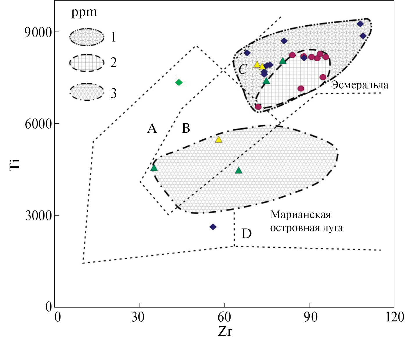 Рис. 11. Ti‒Zr дискриминантная диаграмма. 1 – зона составов вулкана Эсмеральда (по нашим данным); 2 – зона составов (по [Stern, Bibee, 1984]); 3 – зона составов Марианской островной дуги; B и С – поле базальтов океанического дна; A и B – поле островодужных толеитов; A, B и D – поле щелочноземельной серии пород. Условные обозначения см. рис. 6.