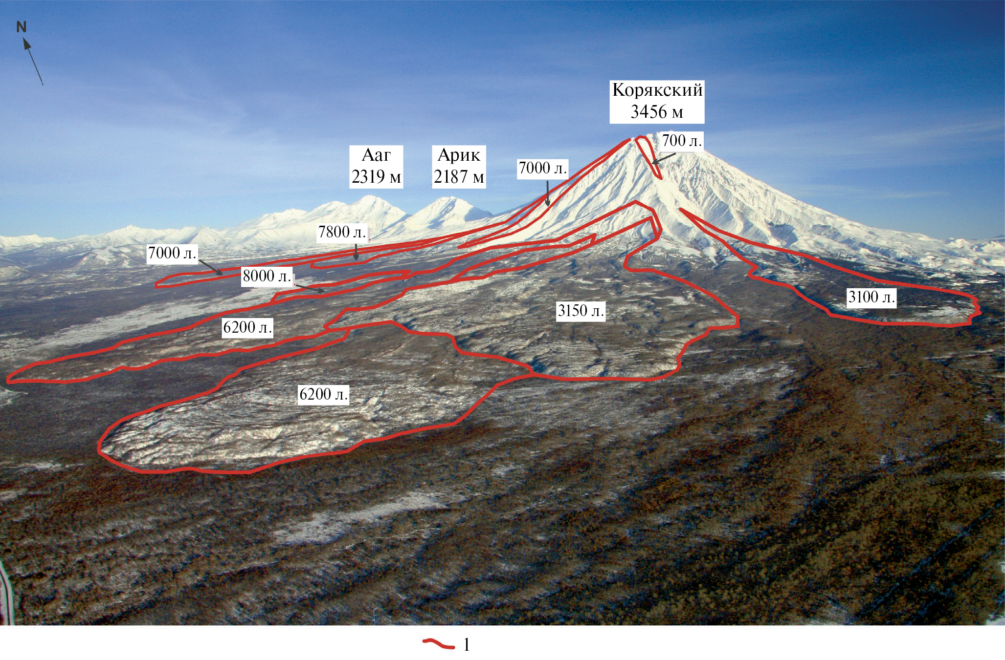 Рис. 2. Лавовые потоки вулкана Корякский. Высоты вулканов – по [Масуренков и др., 1991]. Контуры и возраст (календарных лет) лавовых потоков – по [Пономарева и др., 2016; Голоценовый …, 2023]. Фото А.В. Сокоренко. 1 – контуры лавовых потоков.