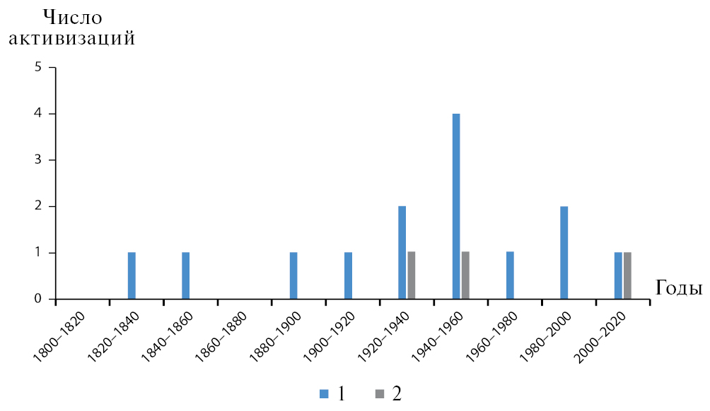 Рис. 5. Гистограмма активности вулкана Корякский в историческое время (на основе табл. 1). 1 – фумарольная активность, 2 – пепловые выбросы.