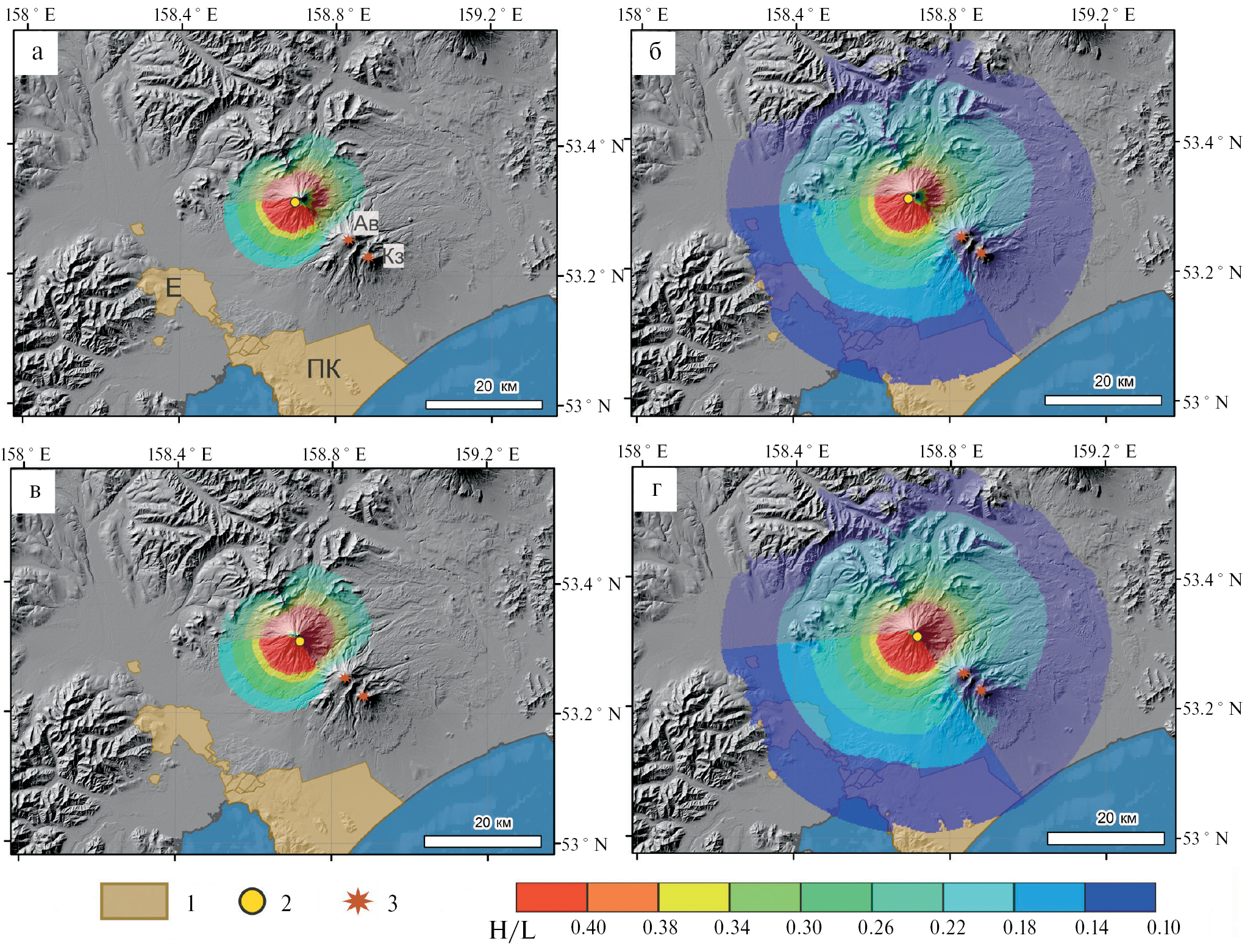 Рис. 6. Моделирование распределения параметра H/L, определяющего мобильность обломочных лавин на вулкане Корякский. а, б – лавина начинается на юго-западном склоне; в, г – лавина начинается на юго-восточном склоне (а, в – высота обрушающегося блока 5 м, значения H/L ~0.3; б, г – высота обрушающегося блока 100 м, значения H/L ≥0.1). 1 – территории населенных пунктов: ПК – Петропавловск-Камчатский, Е – Елизово; 2 – место начала движения обломочной лавины; 3 – вулканы: Ав – Авачинский, Кз – Козельский.