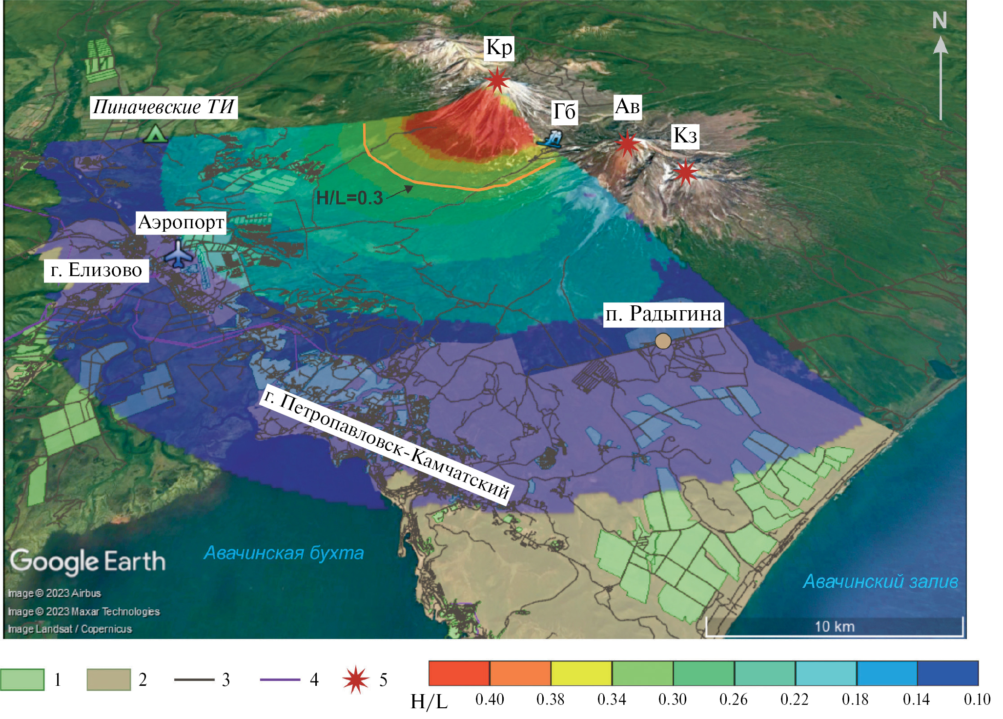Раннее В.В. Адушкин с соавторами [1995] на основе рассмотренного ими механизма разрушения вулканической постройки за счет субгоризонтального внедрения магматического вещества также предположили наиболее вероятный сценарий обвала в юго-западном направлении с дальностью распространения лавин 30–50 км и площадью лавинных отложений 80–1500 км2, объем возможного лавинного обрушения ~8 км3. Такие параметры обломочной лавины соответствуют значениям H/L, близким 0.1, то есть области, закрашенной синим цветом на рис. 7. Это наихудший из рассматриваемых в данном исследовании сценариев, при котором в опасную зону попадают густонаселенные районы, военные объекты, расположенные, например, в поселке Радыгина, а также объекты инфраструктуры (аэропорт и морской порт, дороги, линии электропередач и т.д.).