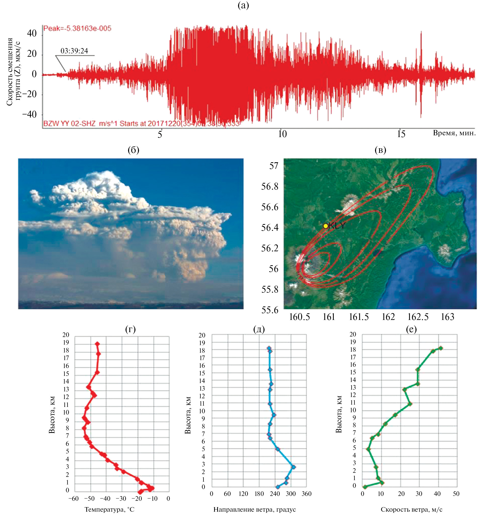 а – вертикальная компонента скорости смещения грунта сейсмического сигнала на BZW, сопровождавшего эксплозивное землетрясение 20.12.2017 г. вулкана Безымянный; б – фотография из KZY эруптивного облака на момент времени 03:59; в – расчетные изопахиты для отложений пирокластики извержения 20.12.2017, по [Girina et al., 2018]; г, д, е – температурная и ветровая стратификации атмосферы по данным баллонного зондирования в KLY 00:00 20.12.2017 г.
