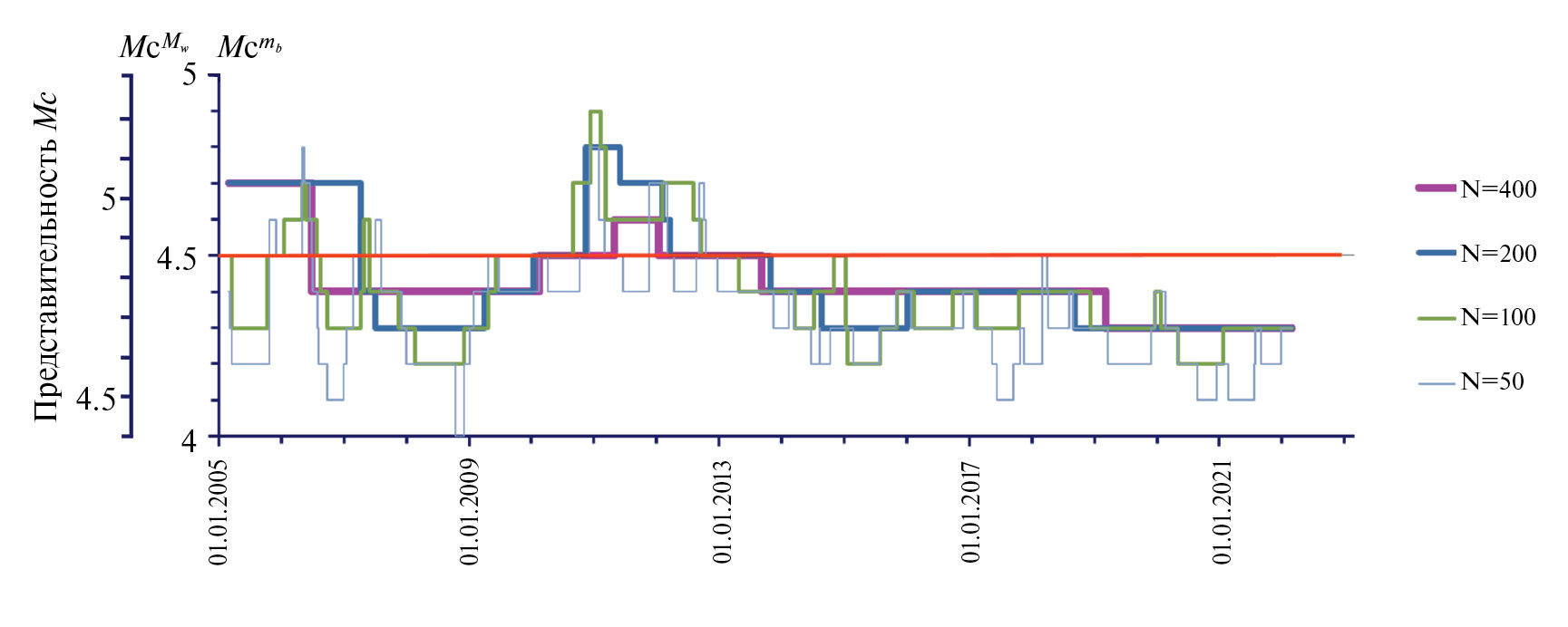 Рис. 3. Представительность каталога землетрясений Mc в 2005–2022 гг. в скользящих окнах шириной N = 50–400 представительных землетрясений.