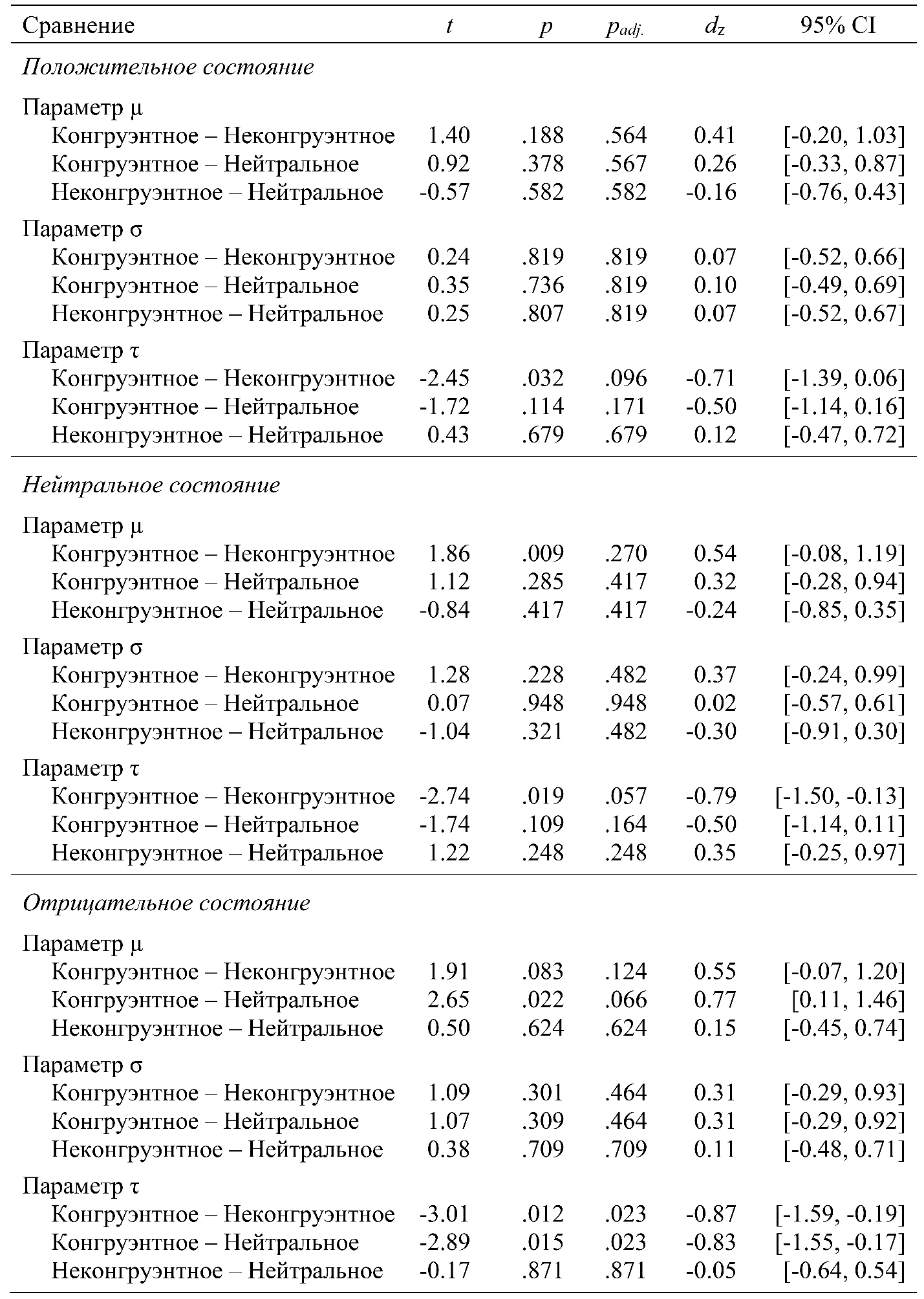 Результаты сравнений представлены в Таблице 3. По пропорции замедленных ответов (τ) при сравнении конгруэнтного условия с неконгруэнтным и нейтральным величины эффектов варьировались от умеренных до высоких, тогда как при сравнении неконгруэнтного условия с нейтральным – от незначительных до слабых. Однако общий паттерн величин эффектов для разных параметров распределения оставался единообразным и практически не зависел от индуцированного эмоционального состояния. Вместе с тем анализ сенситивности для α = .05, статистической мощности 80% и имеющегося объема выборки для дисперсионного анализа (n = 36) и попарных сравнений (n = 24) показал, что проведенный анализ наиболее чувствителен к обнаружению высокой величины эффекта и недостаточно чувствителен к умеренной и слабой величинам эффекта.