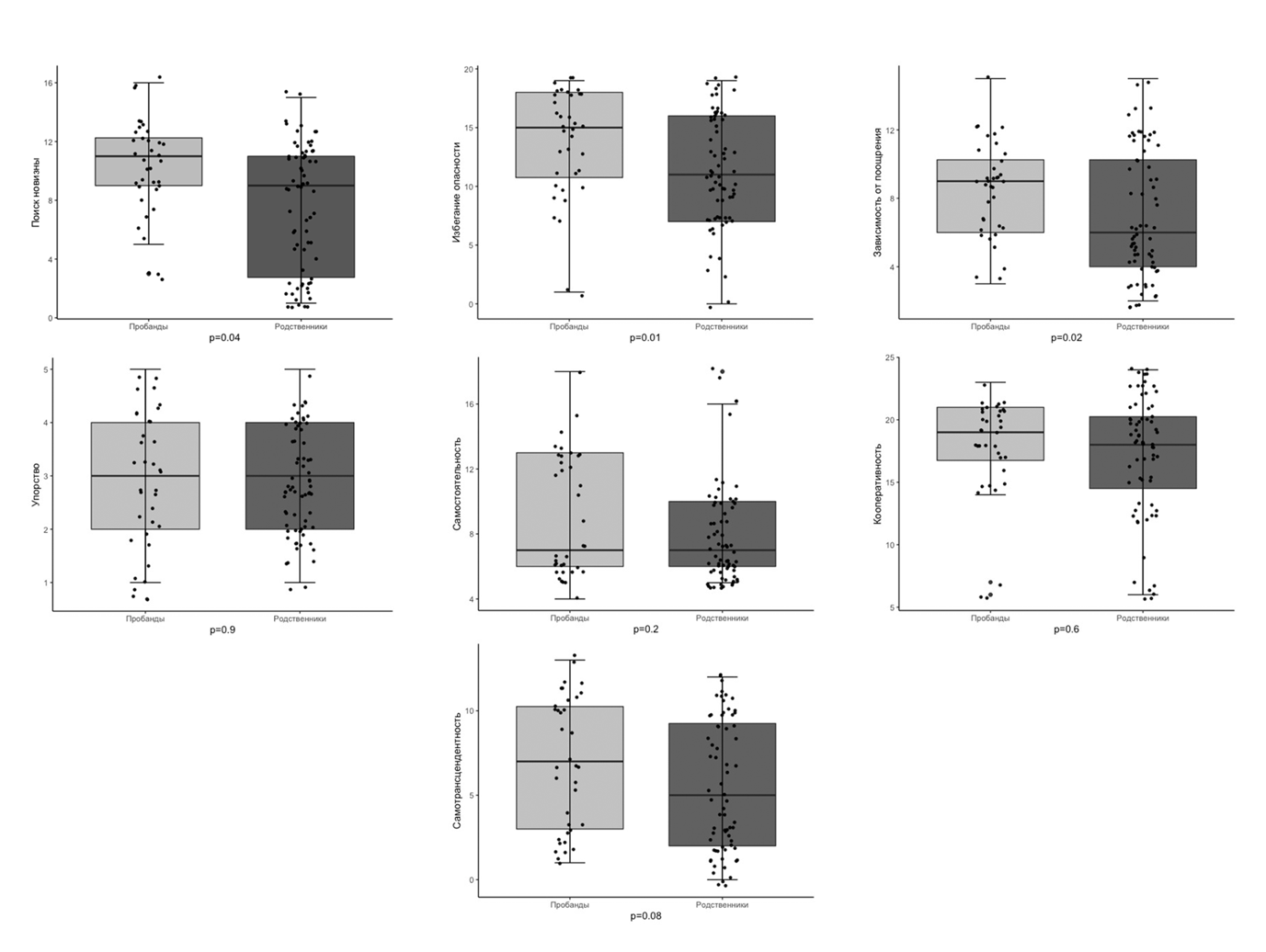 Особый интерес представляло сравнение здоровых родственников пробандов с расстройствами настроения и здоровых родственников пробандов без истории РДР или БАР (см. таблицу 5). Так, здоровые родственники пробандов с расстройствами настроения имели статистически значимо более низкий балл по таким дименсиям, как “поиск новизны” (p=0.001), “избегание опасности” (p=0.09), “зависимость от поощрения” (p=0.001) и “самотрансцендентность” (p=0.003) в сравнении с родственниками пробандов без аффективных расстройств.