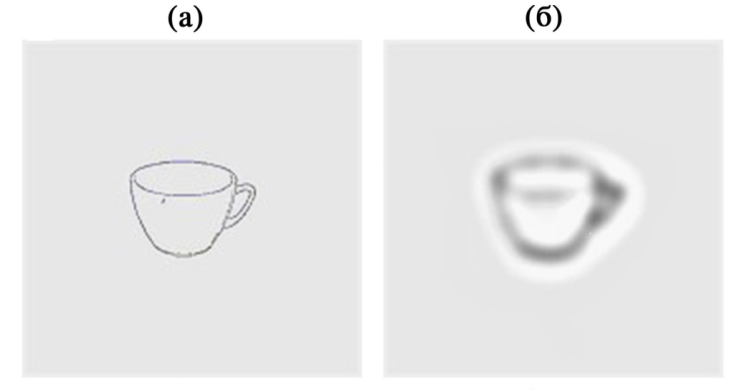 Рис. 1. Пример черно-белого изображения – объекта неживой природы, подвергнутого цифровой фильтрации путем свертки с DoG-функцией в области высоких (а) и низких пространственных частот (б).