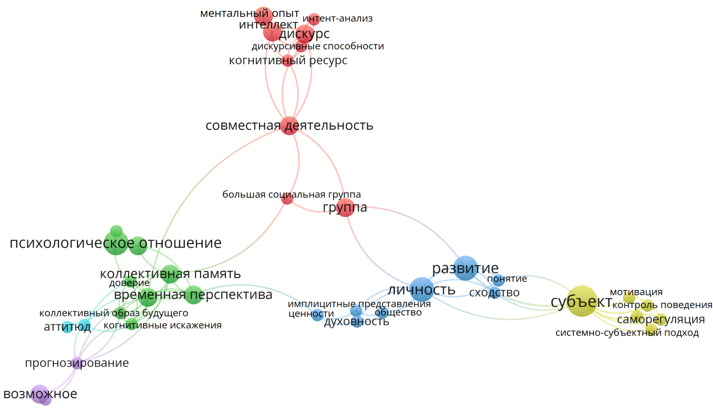 На рис. 5 четко выделились два центра — индивидуального и коллективного субъектов, имеющих множественные прямые и опосредованные связи с другими понятиями. Данное картирование принципиально отлично от распределения понятий при анализе статей в базе данных Scopus за пятилетний период, что свидетельствует о продолжительном периоде инкубации и разработке понятий. Картирование понятий на рис. 5 наглядно показывает, что индивидуальный и коллективный субъекты становятся центрами сетевой организации понятийного пространства.