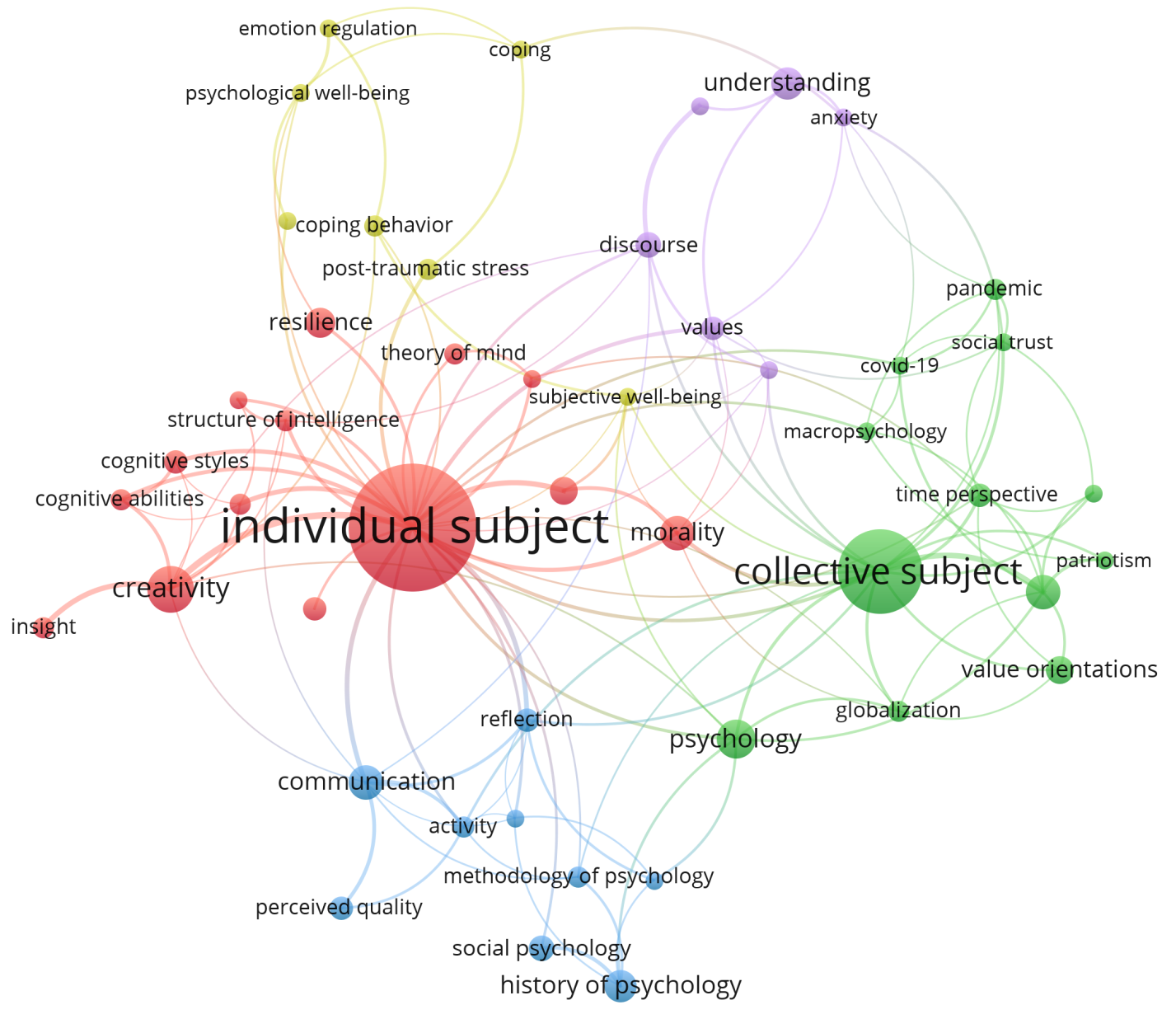 Сравнительный анализ понятий в статьях, опубликованных авторами сборника и индексированных в базе Scopus за пятилетний период, показал, что использование понятия “субъекта” сотрудниками Института психологии РАН занимает отнюдь не лидирующее место и уступает таким понятиям, как “интеллект”, “личность”, “доверие” и ряду других. В то же время картирование понятий в статьях авторов труда в базе Scopus за двадцать один год демонстрирует центральное положение понятий индивидуального и коллективного субъекта, их множественные связи с другими категориями в психологическом пространстве. Наше предположение, что авторские категории теоретически могут быть сопоставлены с понятиями индивидуального и коллективного субъекта, но не эксплицированы в ключевых словах и аннотациях за пятилетний период, нашло свое подтверждение в картировании за 20 лет.