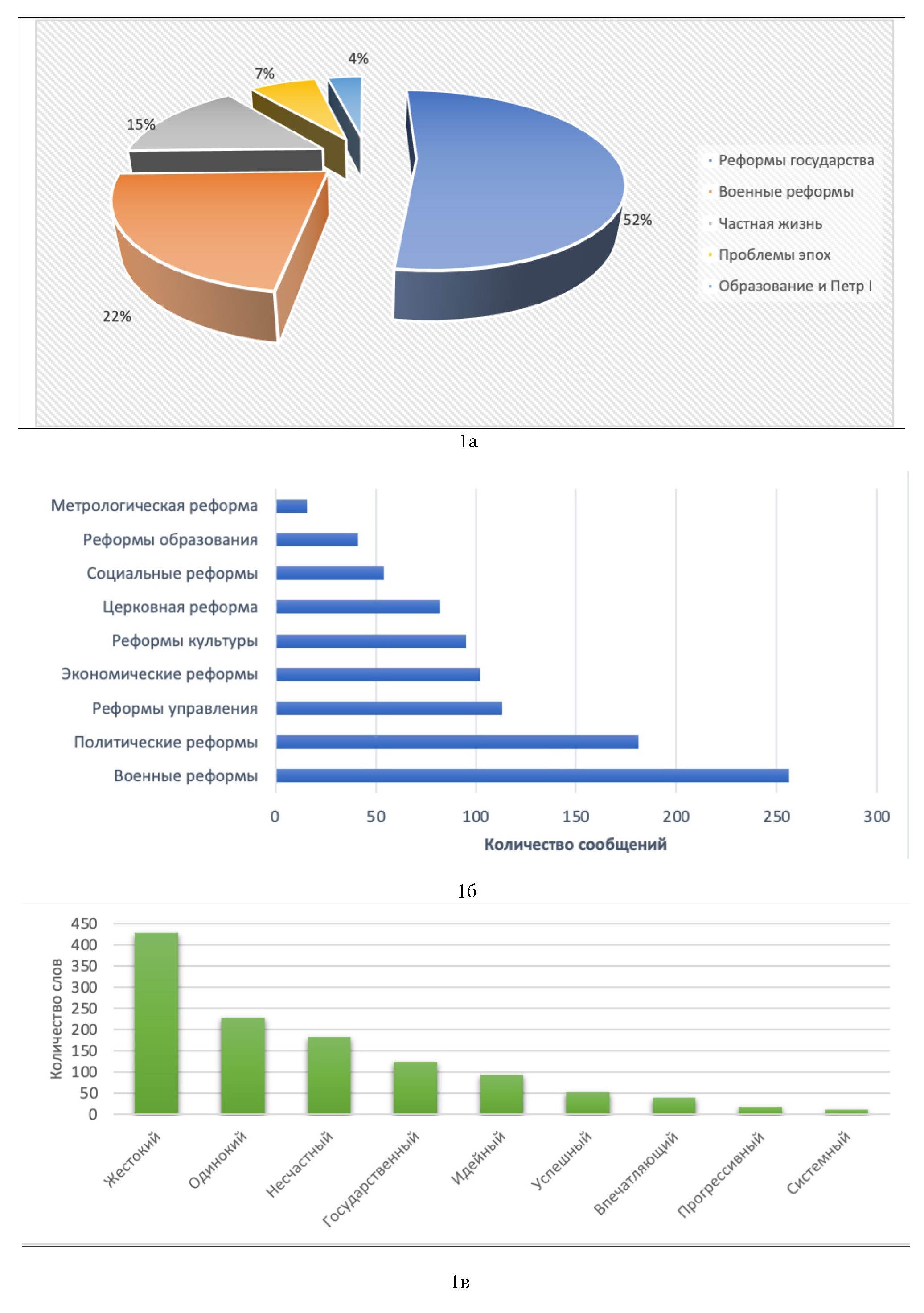Содержательный анализ текстов сообщений в социальной сети “ВКонтакте” позволяет отметить, что предметом обсуждения пользователей становятся различные стороны жизни и деятельности Петра I: его реформаторская деятельность (как внутриполитическая, так и международная), обсуждаются проблемы исторической эпохи, даются оценки его индивидуально-личностных характеристик как политического деятеля и человека. В ходе исследования было собрано 2 574 сообщения. Итоги анализа количественных характеристик обсуждаемых проблем представлены на рисунке 1а. В структуре обсуждений отдельно запрашиваются “реформы государства” (количество — 347), “военные реформы и международная деятельность” (593), “проблемы эпох” (180) — периода жизнедеятельности императора и последующего периода времени, включая современное состояние общественно-политической ситуации в России, а также всевозможные оценки, связанные с “психологическим портретом” императора (371) — его нрав, устремления, индивидуально-личностные характеристики, специфика взаимодействия и общения с ближним к нему социальным кругом. В качестве самостоятельных выделены запросы, связанные с обсуждением образовательных проблем, отражающих ситуацию по изучению периода правления Петра I (83). Как видно из рисунка, личностные характеристики императора являются самостоятельной проблемой, хотя и не ведущей.