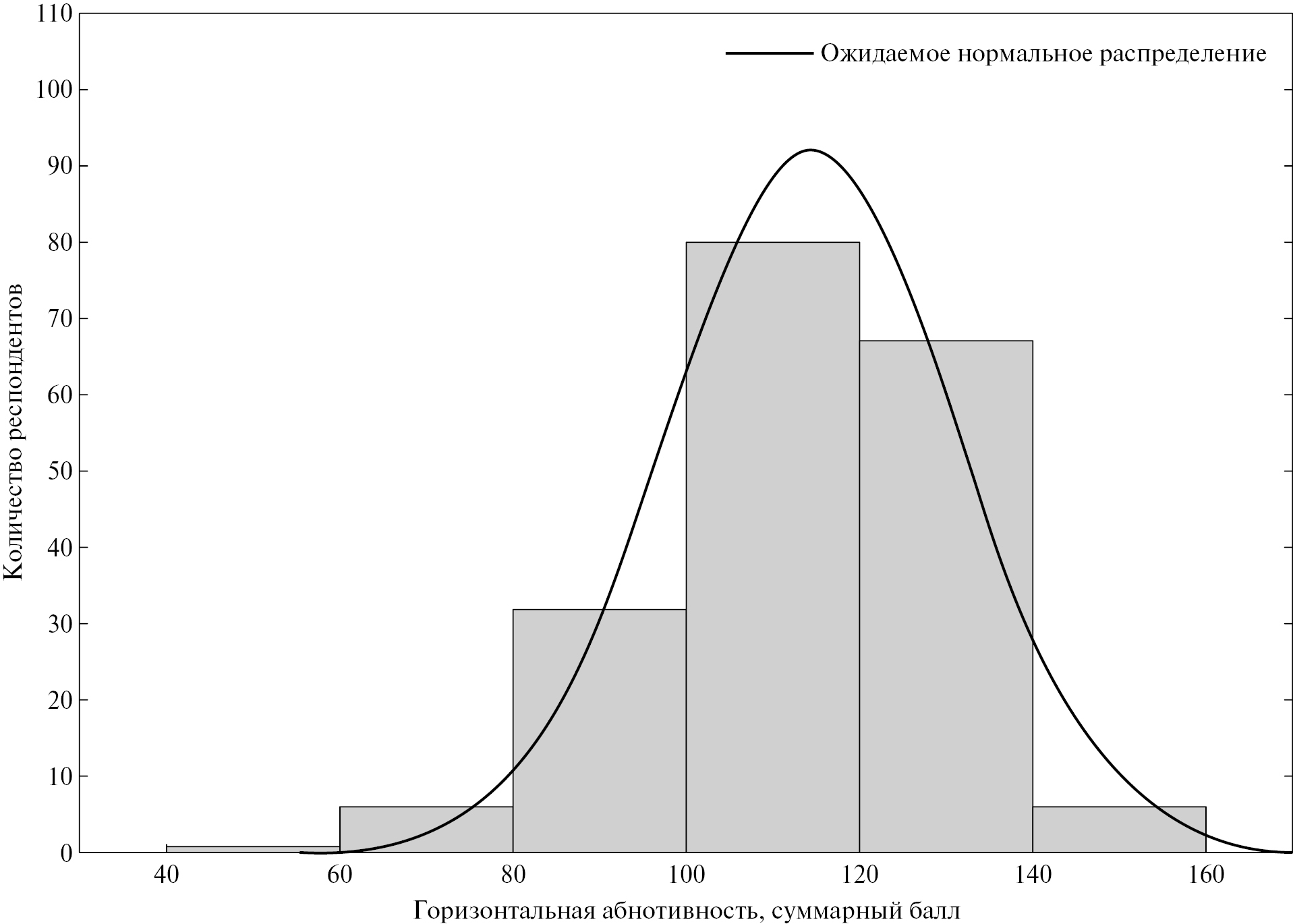 В ходе суммирования ответов респондентов на вопросы модифицированной методики абнотивности получен средний балл — 114, стандартное отклонение — 17. Минимальный балл — 80, максимальный — 144. Медиана составила 115.5. Наиболее часто повторяемый результат (мода) равен 120. Распределение итоговой суммы баллов респондентов имеет незначительную правостороннюю асимметрию (рис. 2), поэтому на следующих шагах обработки данных использовались непараметрические методы обработки.