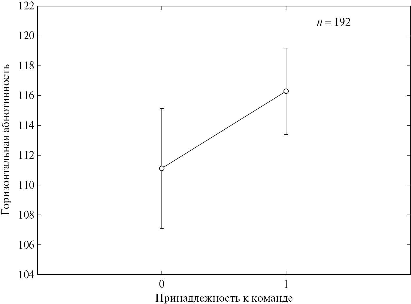 Положительное влияние принадлежности к команде было доказано при применении однофакторного дисперсионного анализа (рис. 4). Респонденты, включенные в состав той или иной команды, имеют достоверно более высокие показатели горизонтальной абнотивности, чем независимо действующие субъекты (F = 4.161; p = 0.042). Можно говорить о том, что работа в составе команды умеренно детерминирует проявление горизонтальной абнотивности (R = 0.1463).