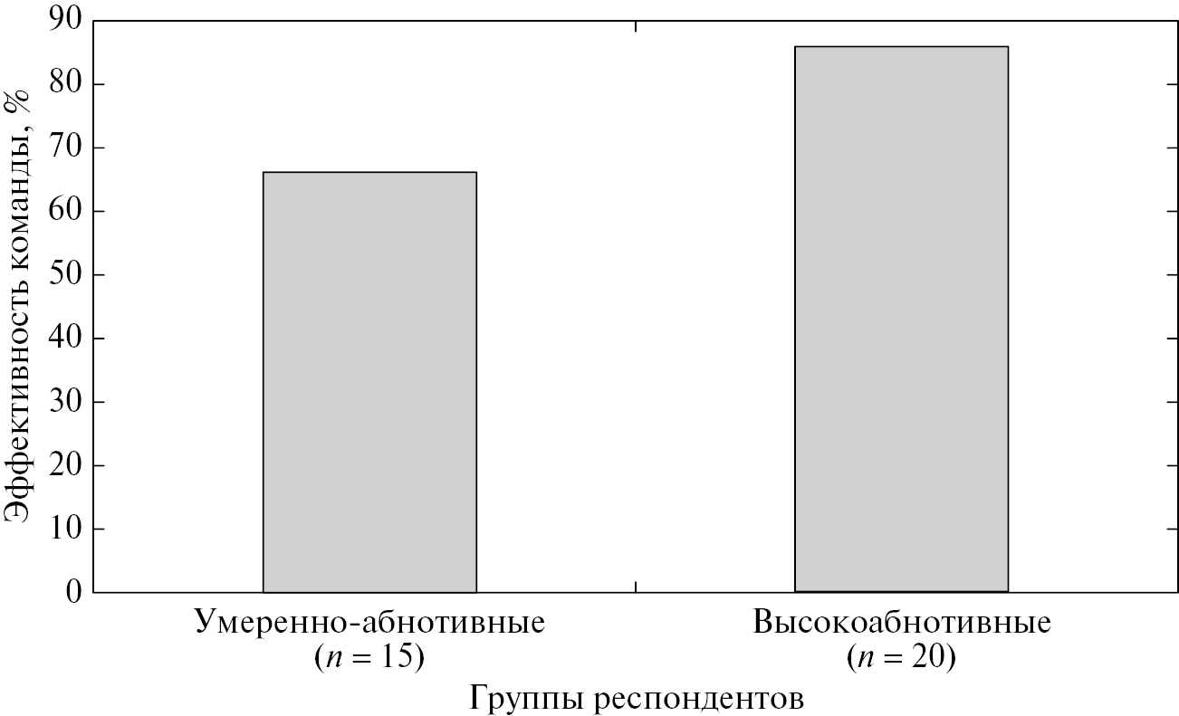 Представители контрастных групп, которые включены в командную работу, позитивно оценивают успешность своих команд. Однако высокоабнотивные респонденты оценивают эффективность команд выше, чем умеренно-абнотивные участники (рис. 8). Между представителями контрастных групп установлены достоверно значимые различия (U = 93.00 и p = 0.002**). Сравнительный анализ проводился только среди умеренно- и высокоабнотивных респондентов, входящих в состав команд.