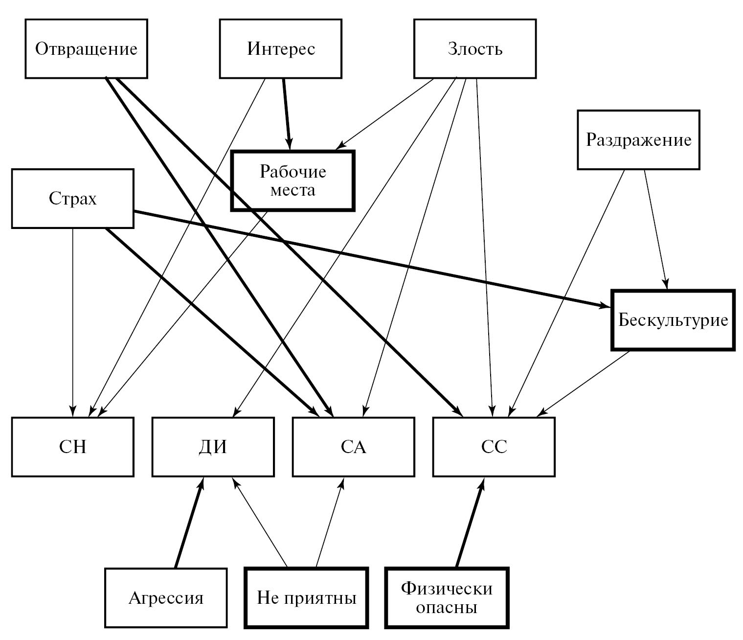 Рис. 1. Модель путей. Мотивы дискриминации обозначены жирными прямоугольниками; отрицательные связи обозначены жирными направленными линиями.