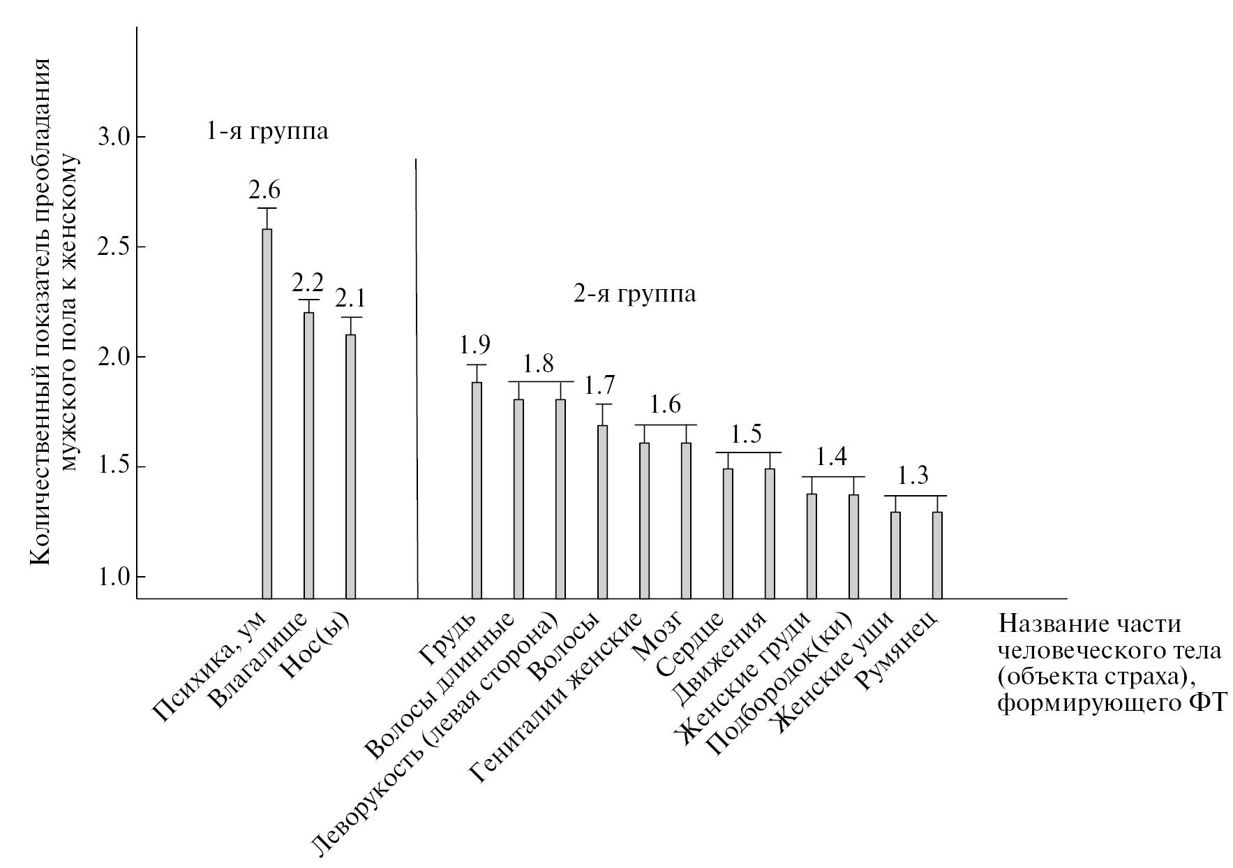 Представленная на рис. 2 гистограмма распространенности частей человеческого тела, формирующих ФТ у мужчин, демонстрирует две разные по численному соотношению группы этих объектов страха. В первую “фобийную” группу, согласно результатам исследований, попали части женского тела, вызывающие у мужчин наибольший страх. Сравнительный анализ объектов страха обеих групп показывает, что наибольший страх вызывает психика (ум)4 (первая группа), а наименьший — румянец на лице и женские уши (вторая группа). Примечательно, что психика из первой группы триггеров страха коррелирует с мозгом из второй группы объектов страха. При этом довольно сложно объяснить “смысловое” наполнение для мужчин этих частей человеческого тела, которые вызывают у них страх и половое влечение одновременно5.