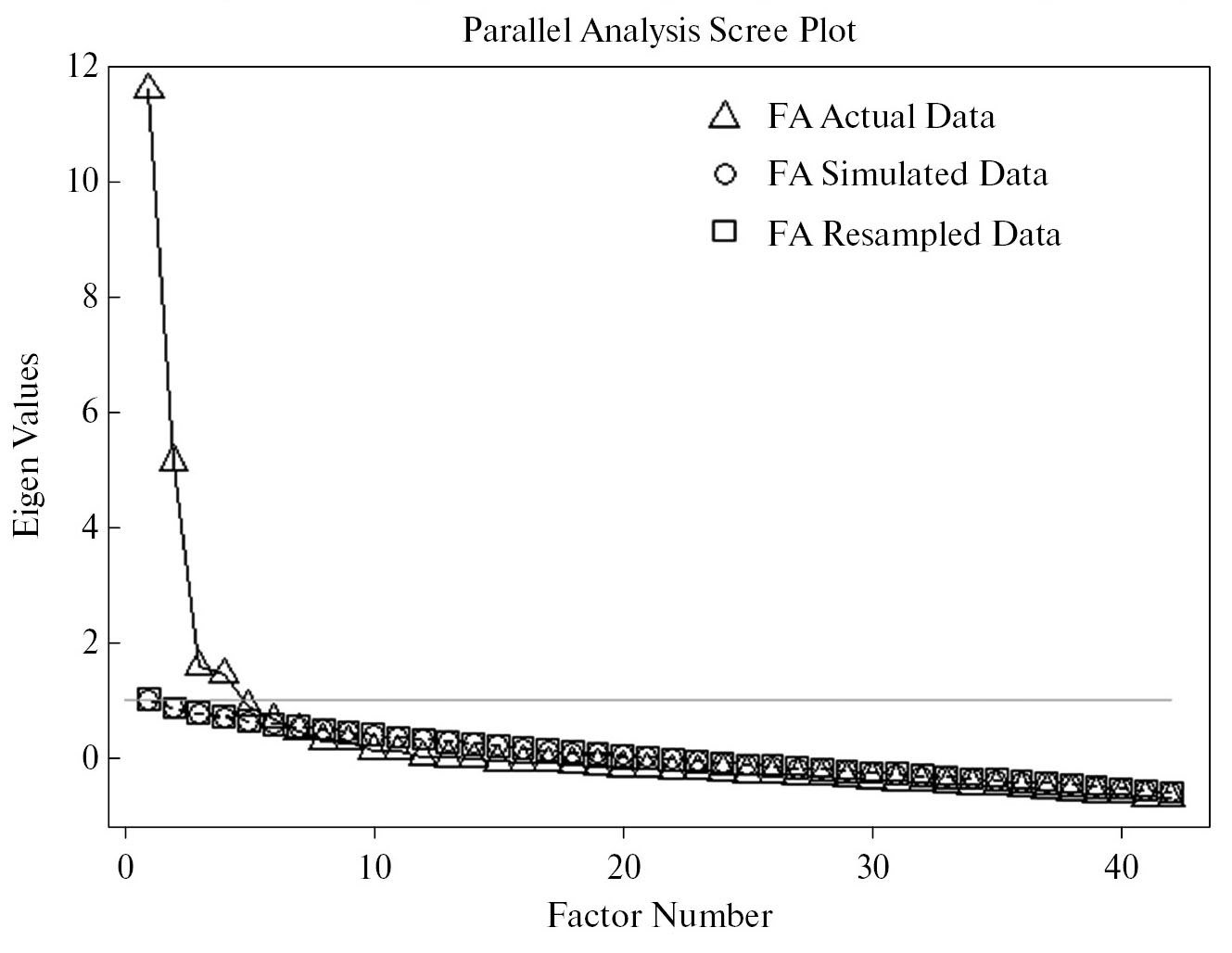 3) результаты анализа графика результатов параллельного факторного анализа (ПФА) и графика “каменистой осыпи” — собственных значений факторов.
