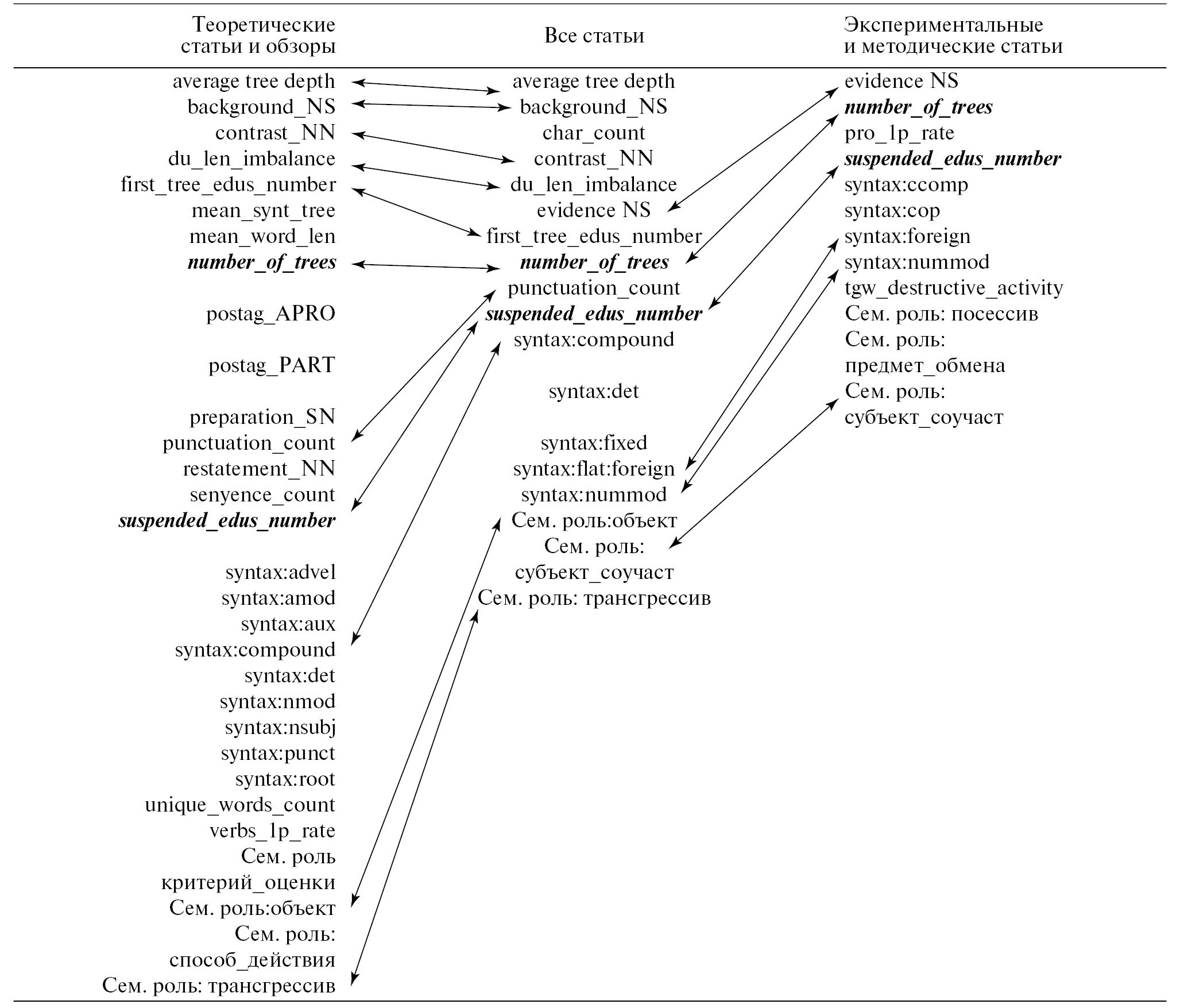Общий объем текстов статей составил более 6395К знаков. Исследование семантико-синтаксической структуры текстов осуществлялось с помощью реляционно-ситуационного анализа (РСА) [4; 5], позволяющего автоматически выявлять различные текстовые показатели: синтаксические признаки, семантические роли и связи, показатели принадлежности словарям различной лексики, дискурсивные показатели теории риторической структуры (ТРС) для представления логико-когнитивной организации текста — всего 261 показатель.
